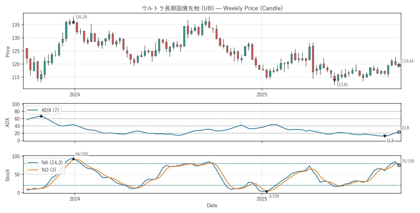 ADX:22.8(11.6〜67.5)|位置 20/100 / Stoch %K:75(3〜94)|位置 79/100