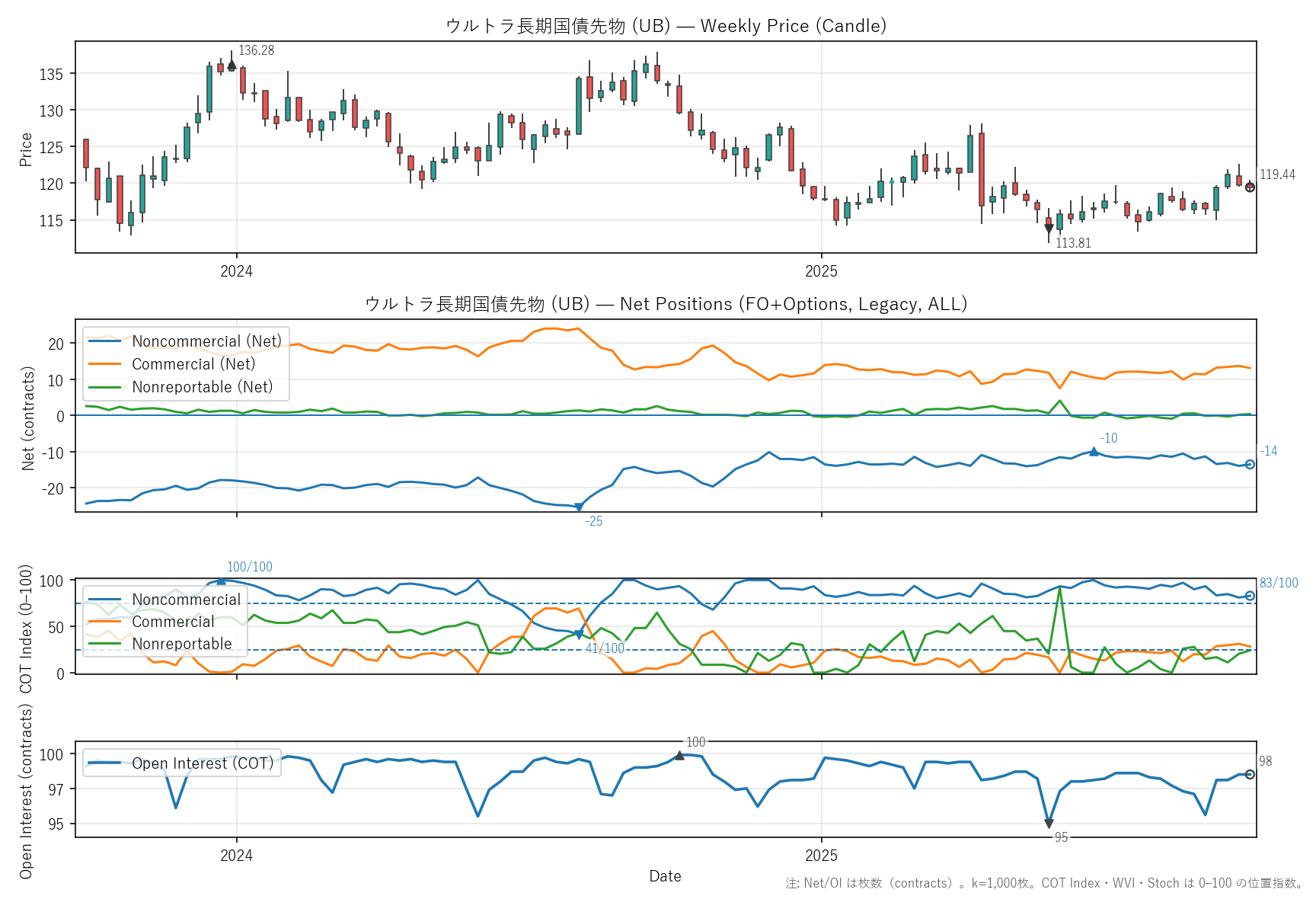 先週比(2025-09-26):非商業COT指数:+0pt(-14 → -14) / 商業COT指数:-1pt(14 → 13) / NR COT指数:+0pt(0 → 0) / Open Interest:-0.00%(98 → 98)