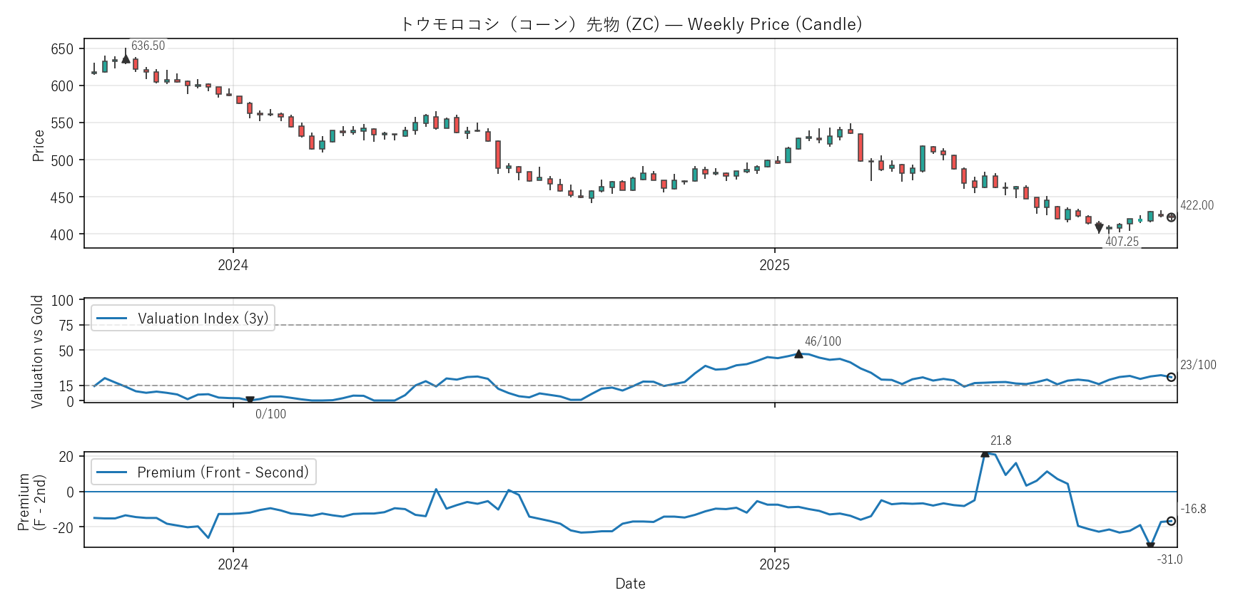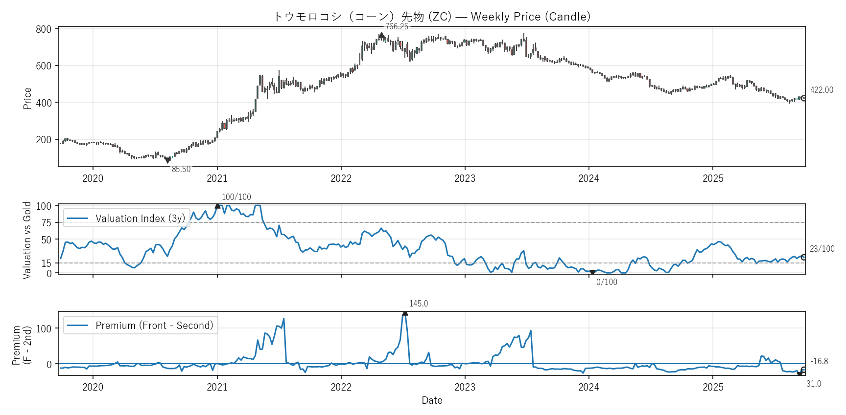 Valuation(WVI)は「基準資産と比べて相対的に高い/安いか」をみる指標。通常は金(GC)、金自身は米30年債(ZB)と比較。価格比(対象/参照×100)を短期/長期EMAで平滑化→差(PAL)の過去位置を0〜100で表示。PremiumはFront−Second(順鞘/逆鞘)。