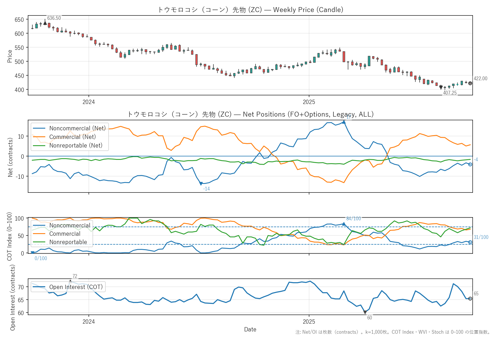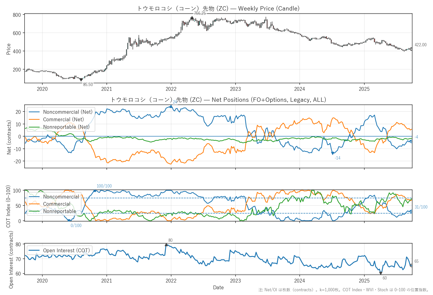 先週比(2025-09-26):非商業COT指数:-1pt(-3 → -4) / 商業COT指数:+1pt(5 → 6) / NR COT指数:+0pt(-2 → -2) / Open Interest:-0.00%(65 → 65)