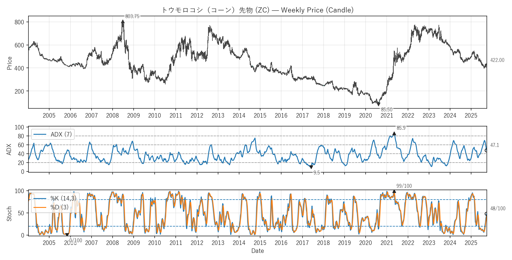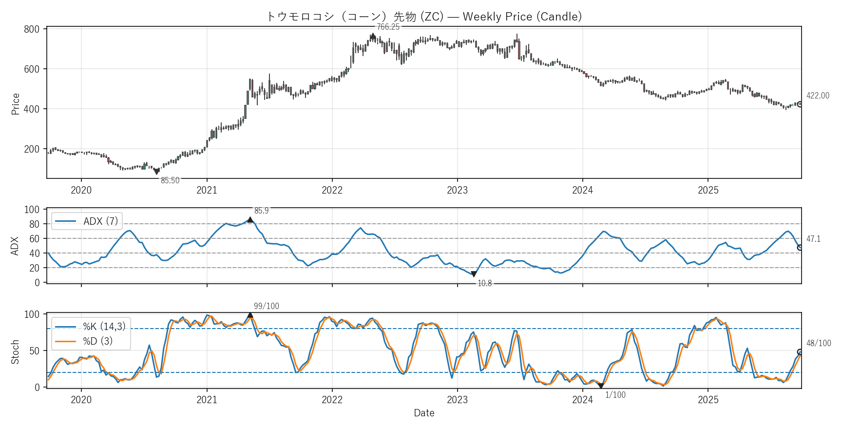 テクニカルは勢い(ADX)と位置(Stoch %K)。ADXは20超=発生、40超=強め。Stochは0〜100で80以上/20以下が目安。