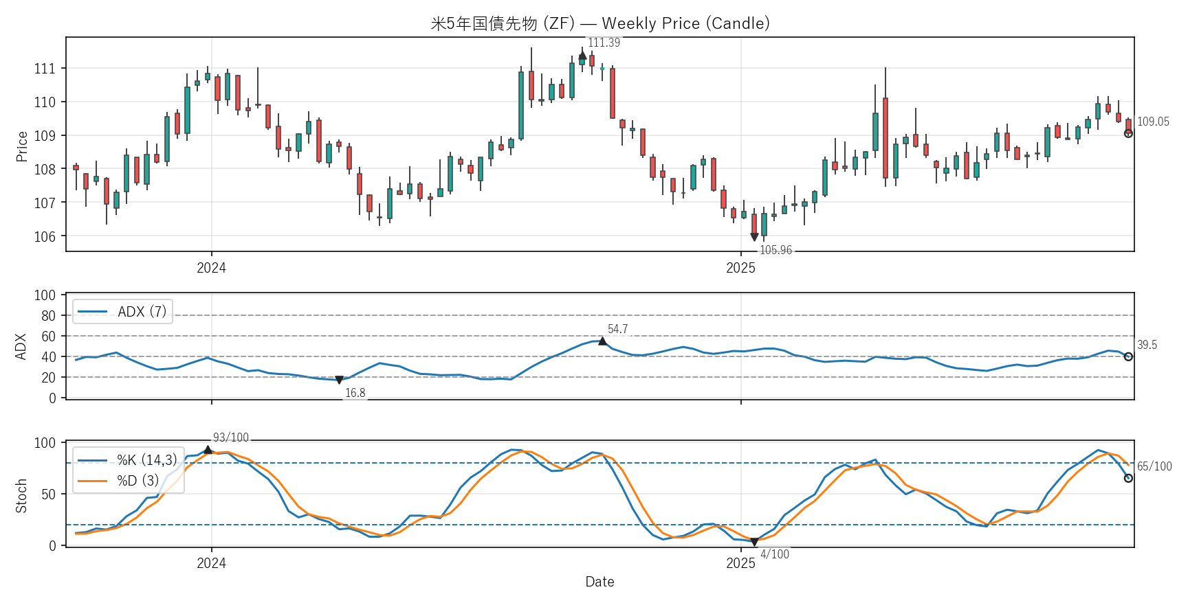 米5年国債先物(5Y T-Note)。FX/CFD例: US5Y(表記は業者差)。注意: 価格↑=利回り↓。