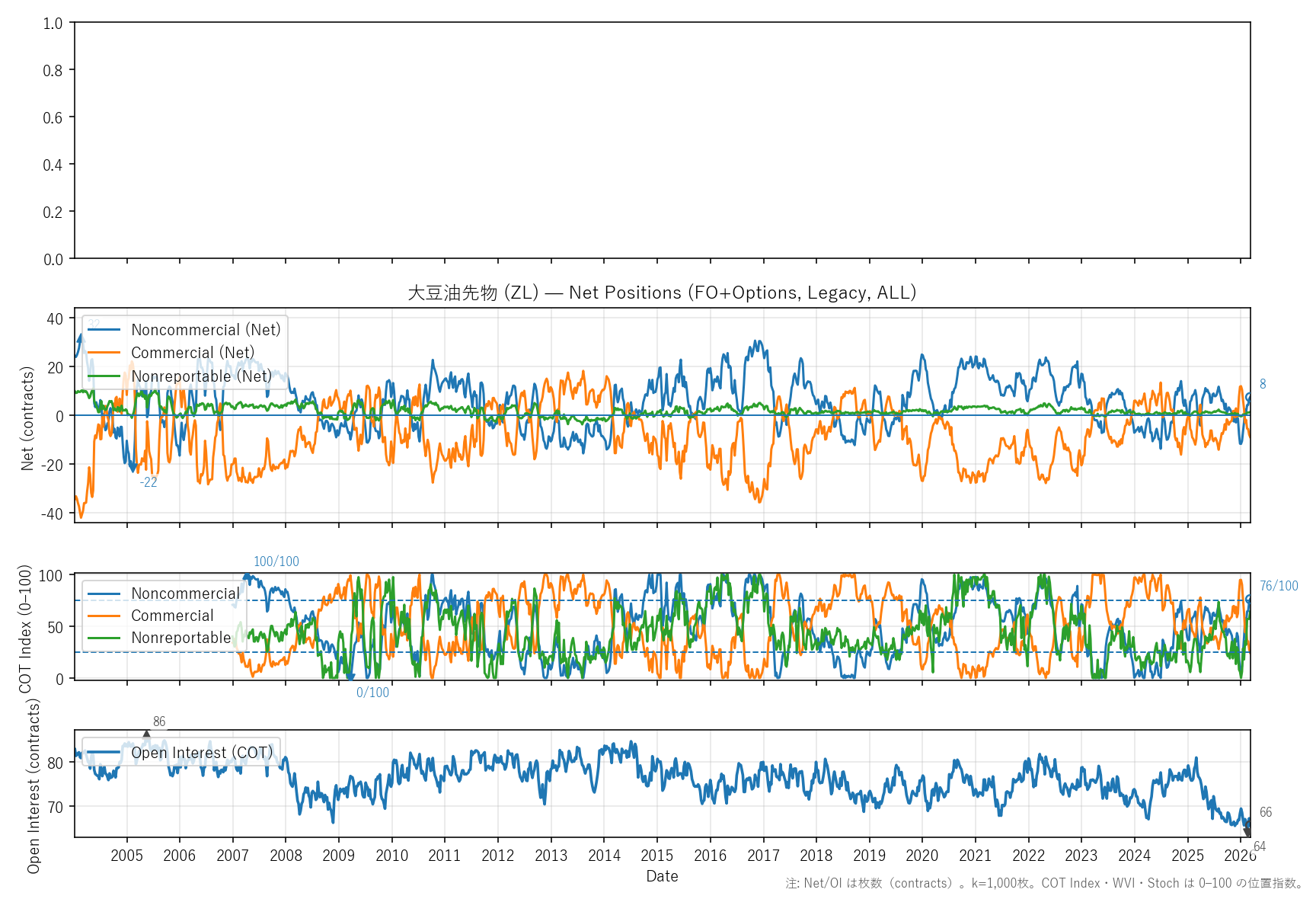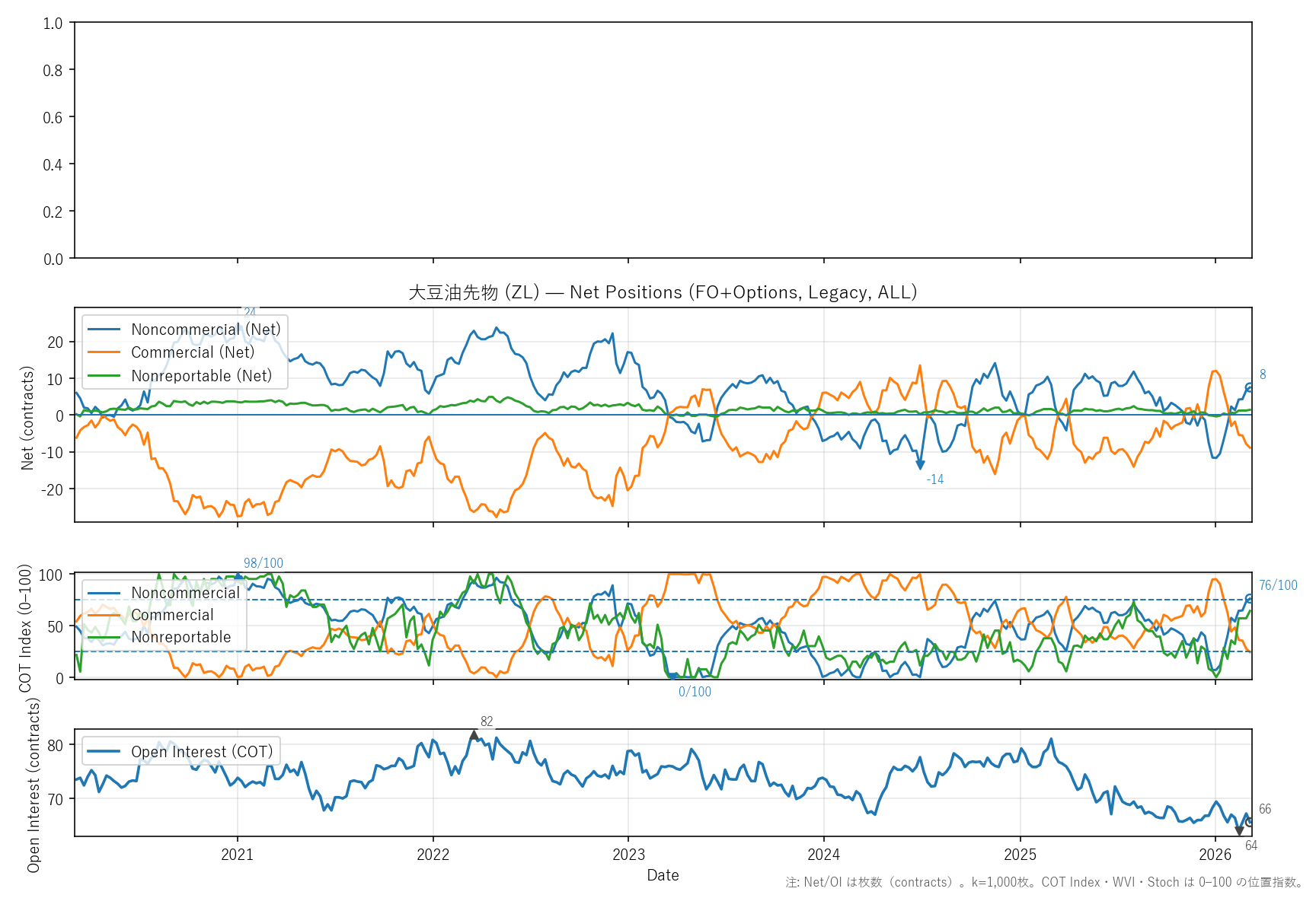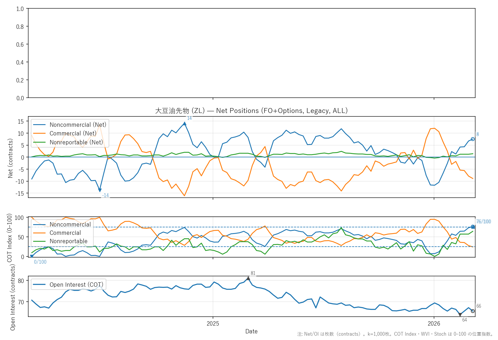 非商業COT指数:76(0〜98)|位置 78/100 / 商業COT指数:24(0〜100)|位置 24/100 / NR COT指数:64(0〜100)|位置 64/100