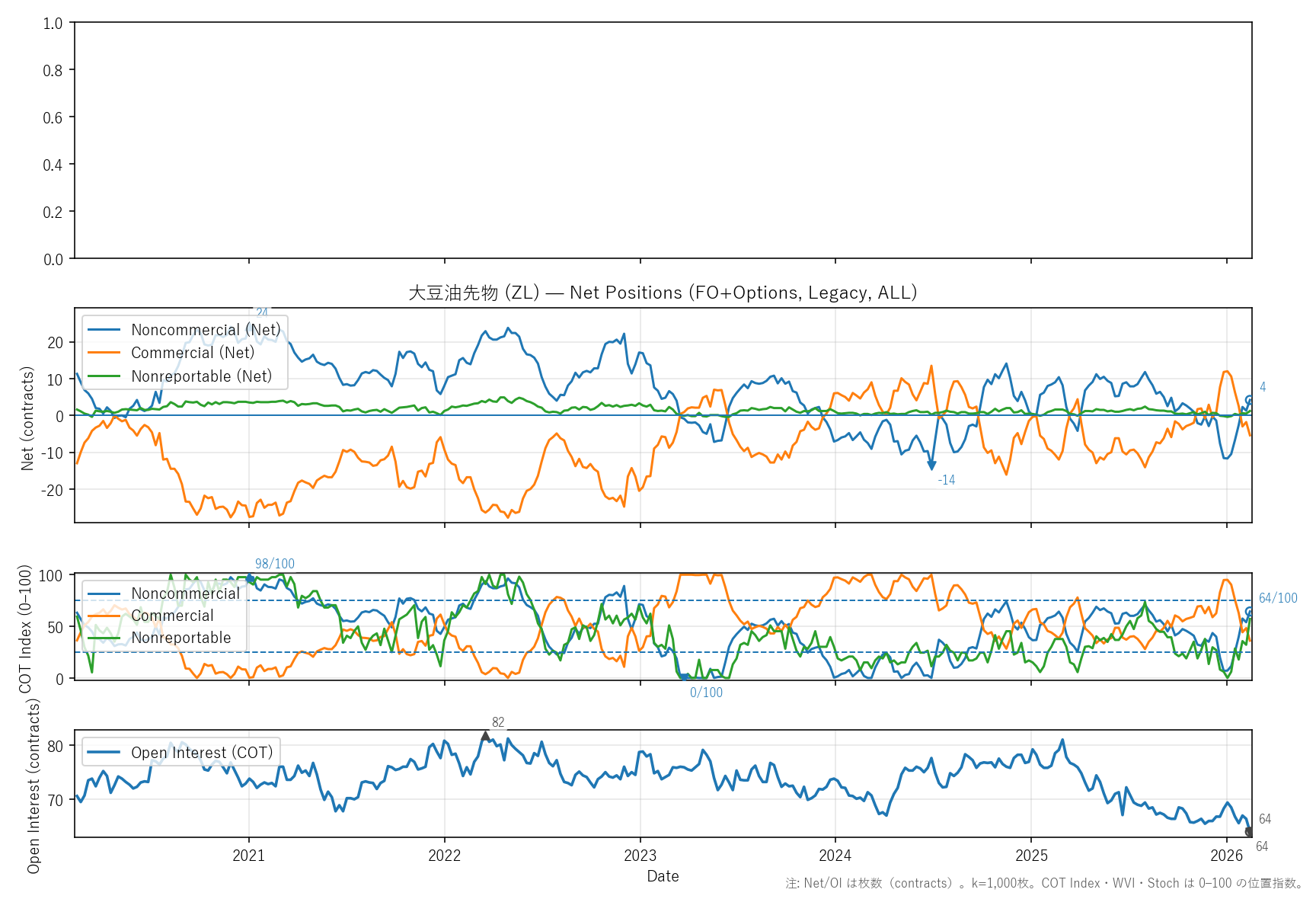 先週比(2026-02-13):非商業COT指数:+3pt(1 → 4) / 商業COT指数:-4pt(-2 → -5) / NR COT指数:+1pt(0 → 1) / Open Interest:-3.61%(66 → 64)