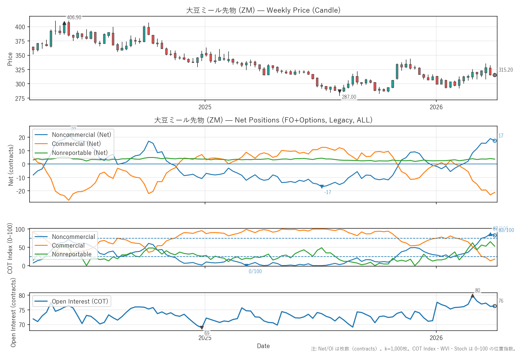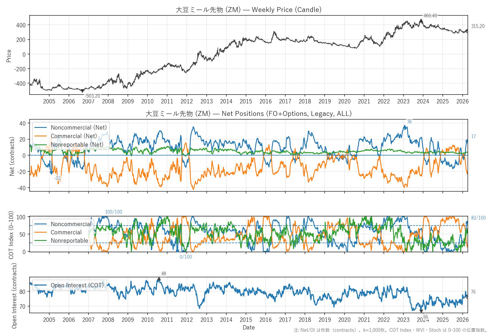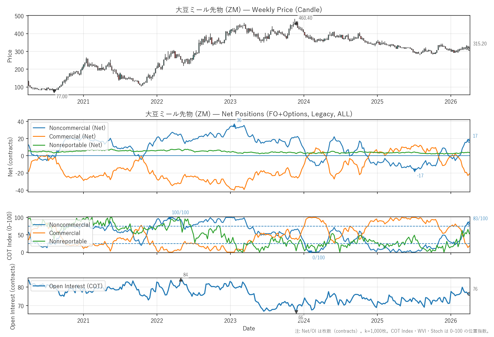 大豆ミール先物(ZM)COTレポート・バリュエーション・テクニカル【週足】