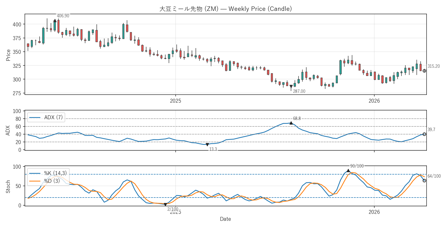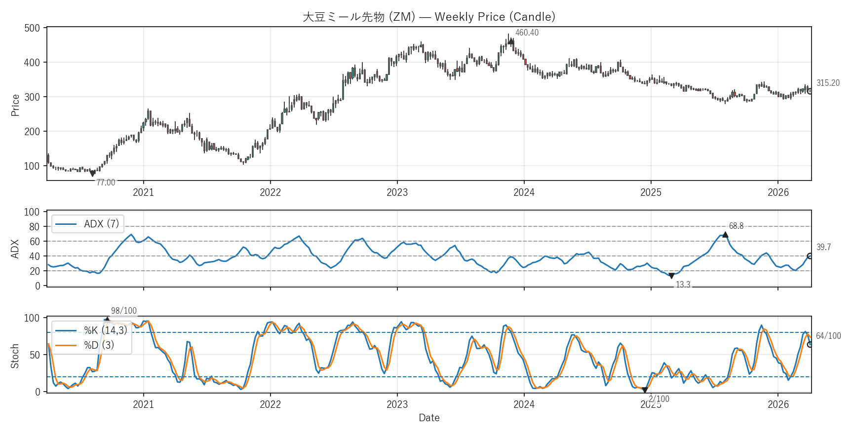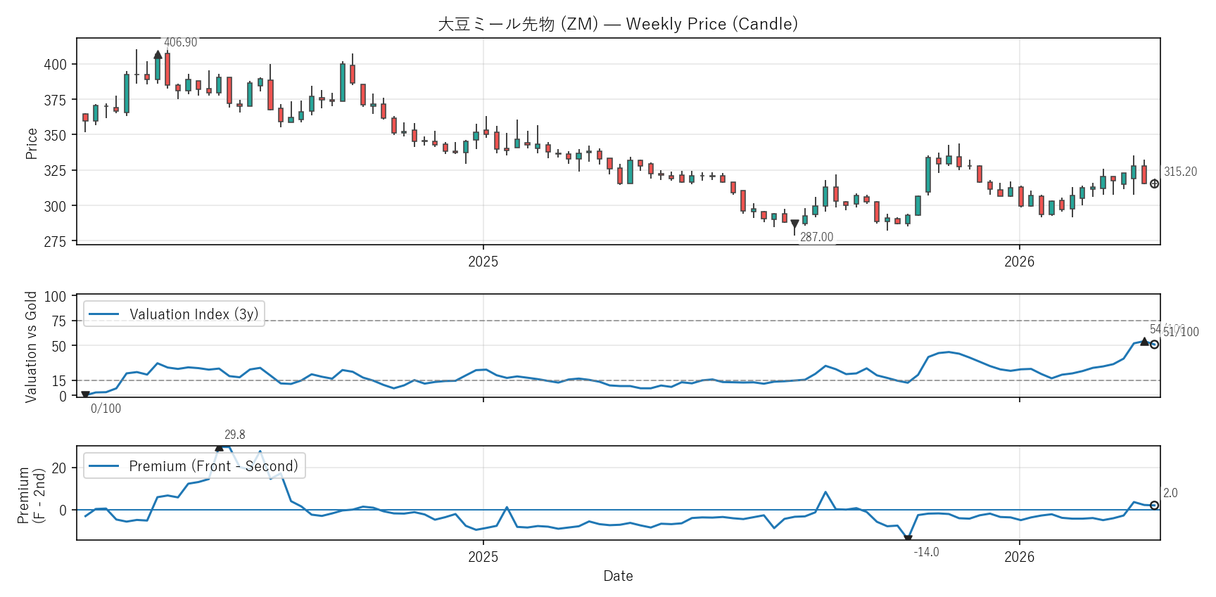 大豆ミール先物(ZM)COTレポート・バリュエーション・テクニカル【週足】