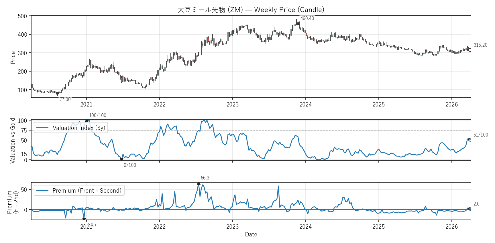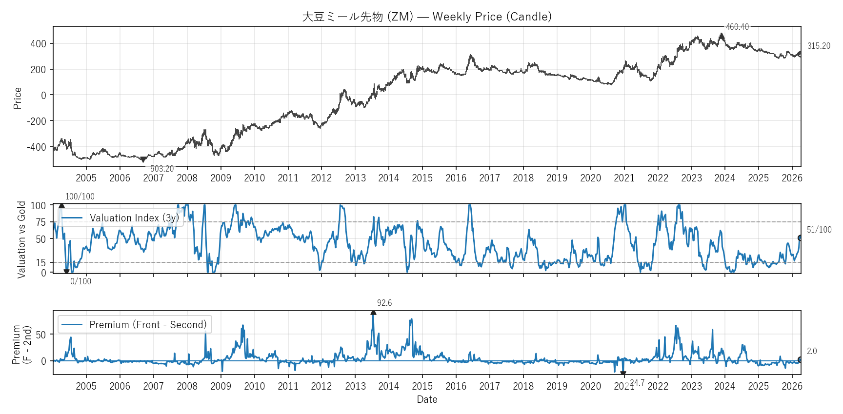 Valuation(WVI)は「基準資産と比べて相対的に高い/安いか」をみる指標。通常は金(GC)、金自身は米30年債(ZB)と比較。価格比(対象/参照×100)を短期/長期EMAで平滑化→差(PAL)の過去位置を0〜100で表示。PremiumはFront−Second(順鞘/逆鞘)。