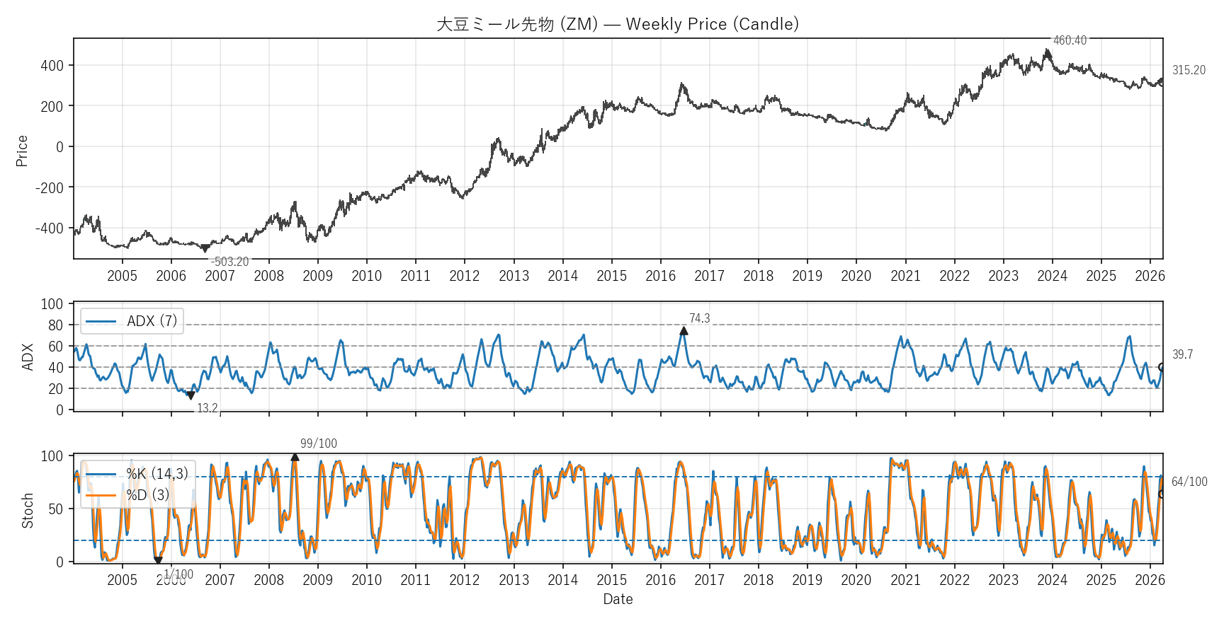 テクニカルは勢い(ADX)と位置(Stoch %K)。ADXは20超=発生、40超=強め。Stochは0〜100で80以上/20以下が目安。