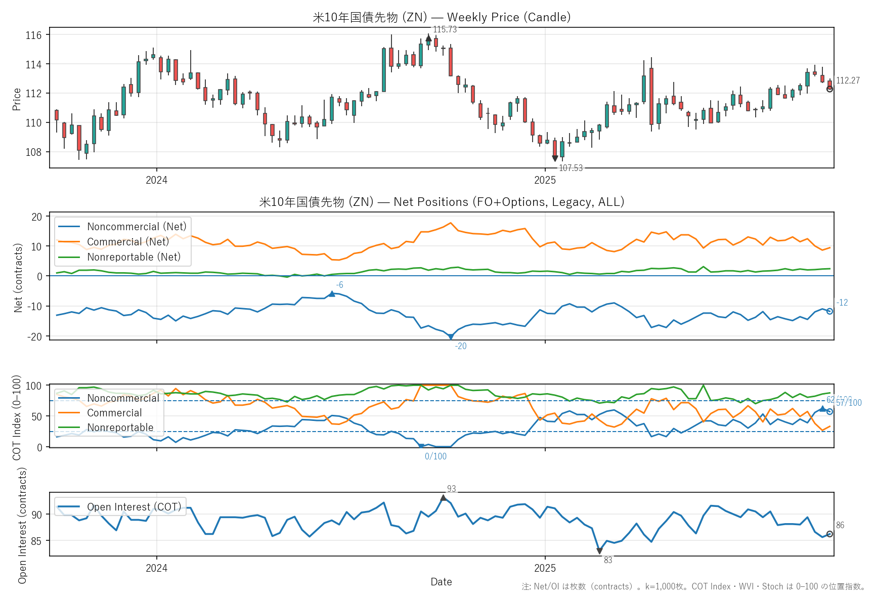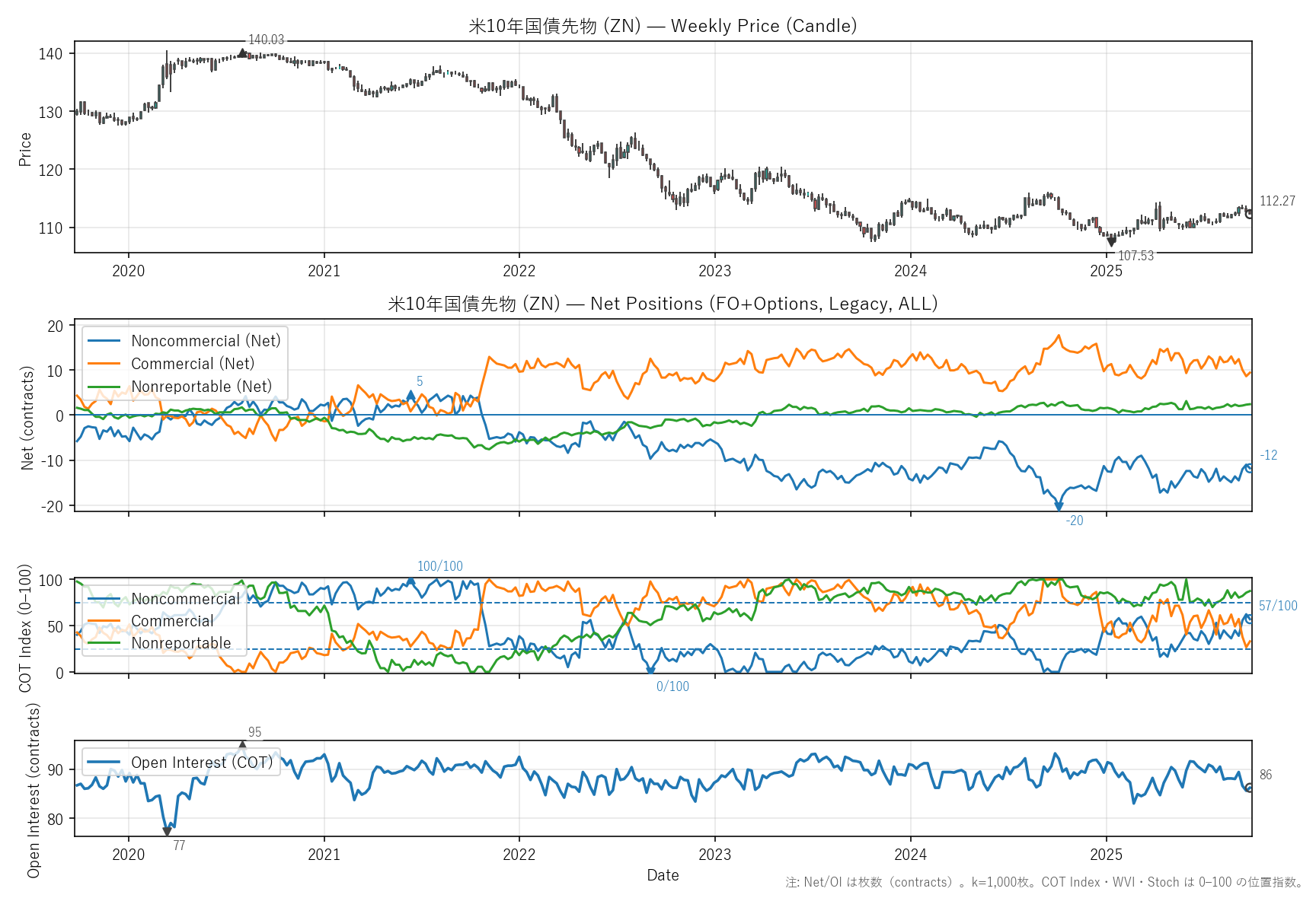 先週比(2025-09-26):非商業COT指数:-1pt(-11 → -12) / 商業COT指数:+1pt(9 → 9) / NR COT指数:+0pt(2 → 2) / Open Interest:+0.70%(86 → 86)