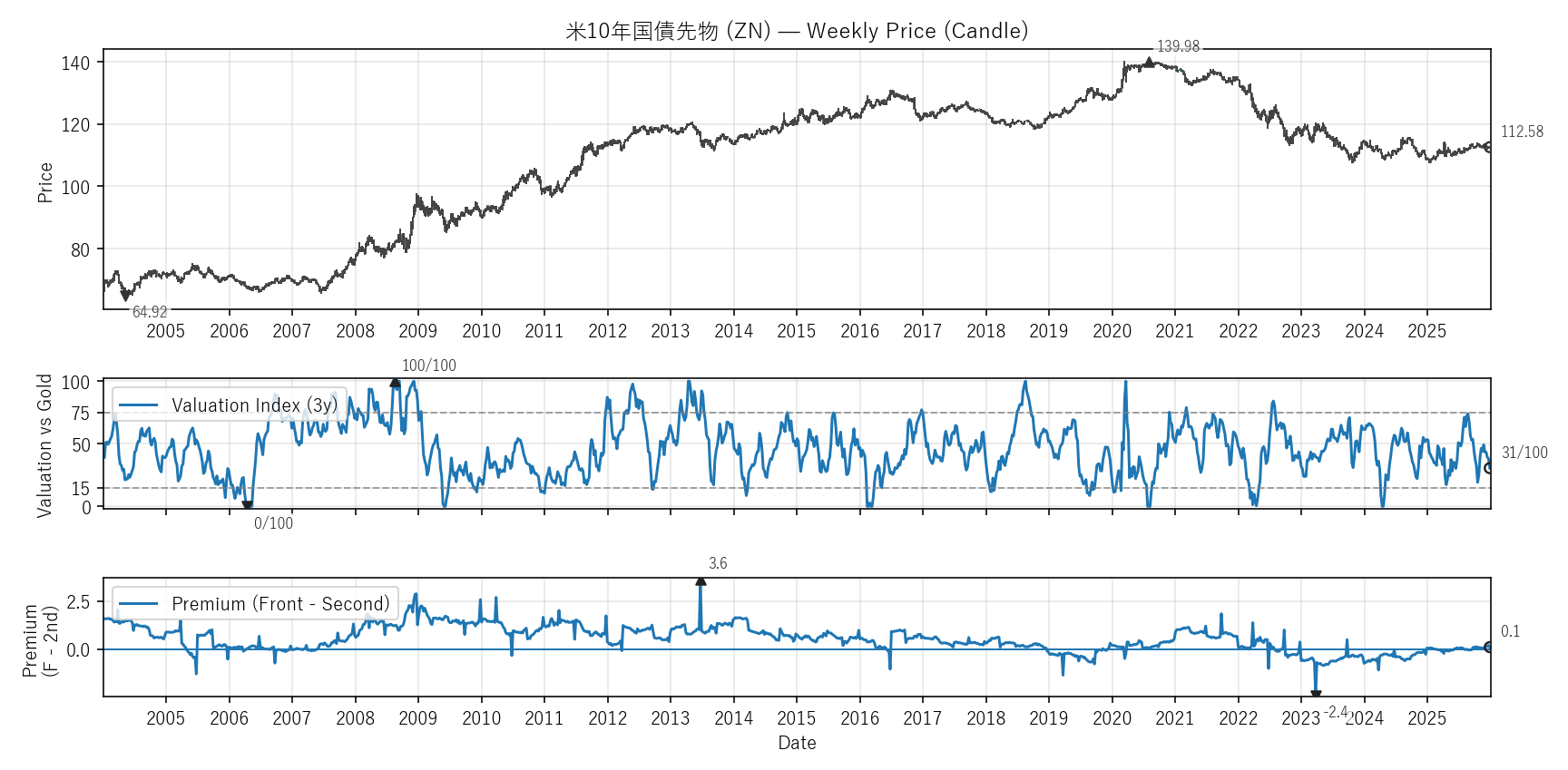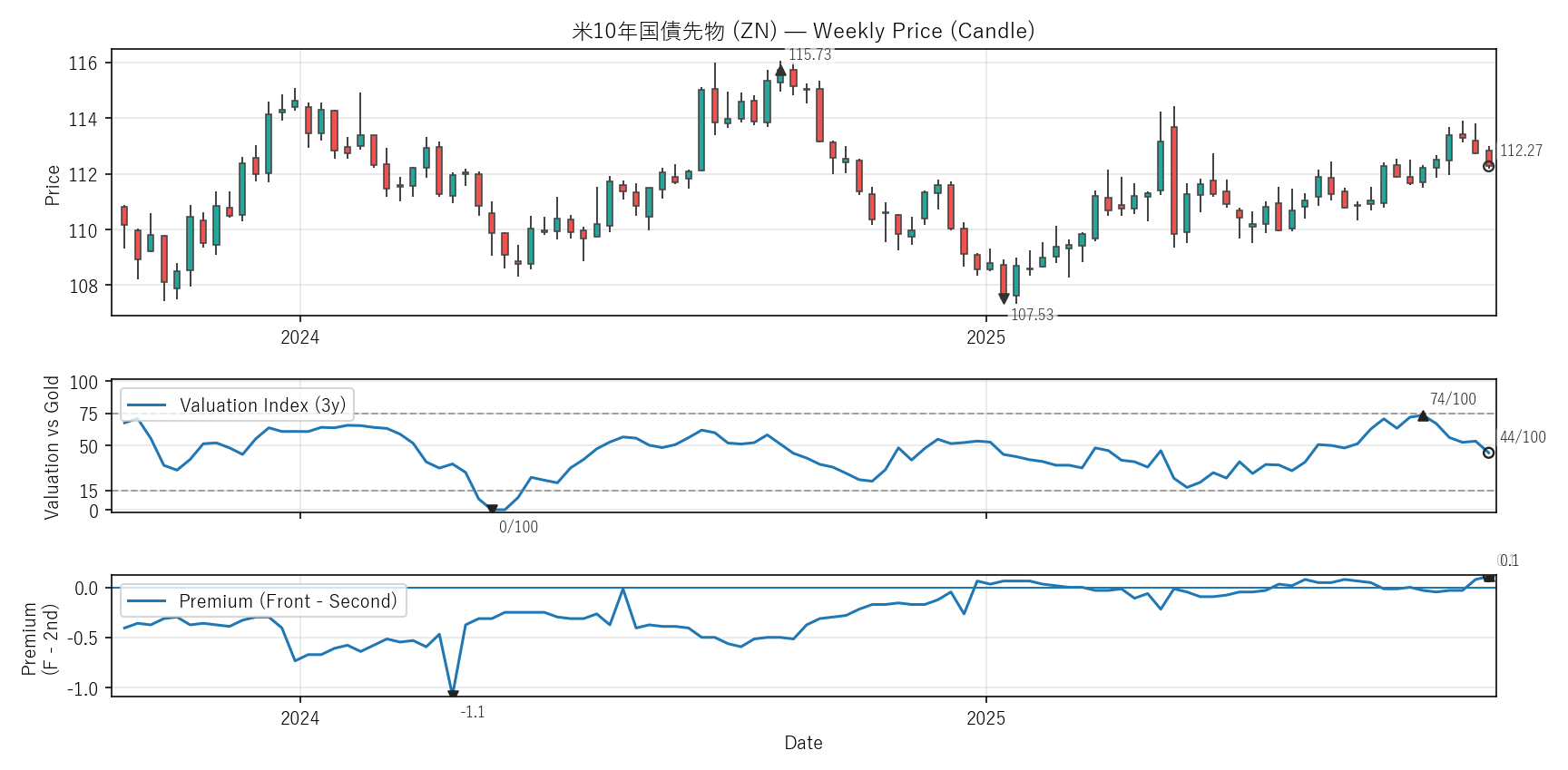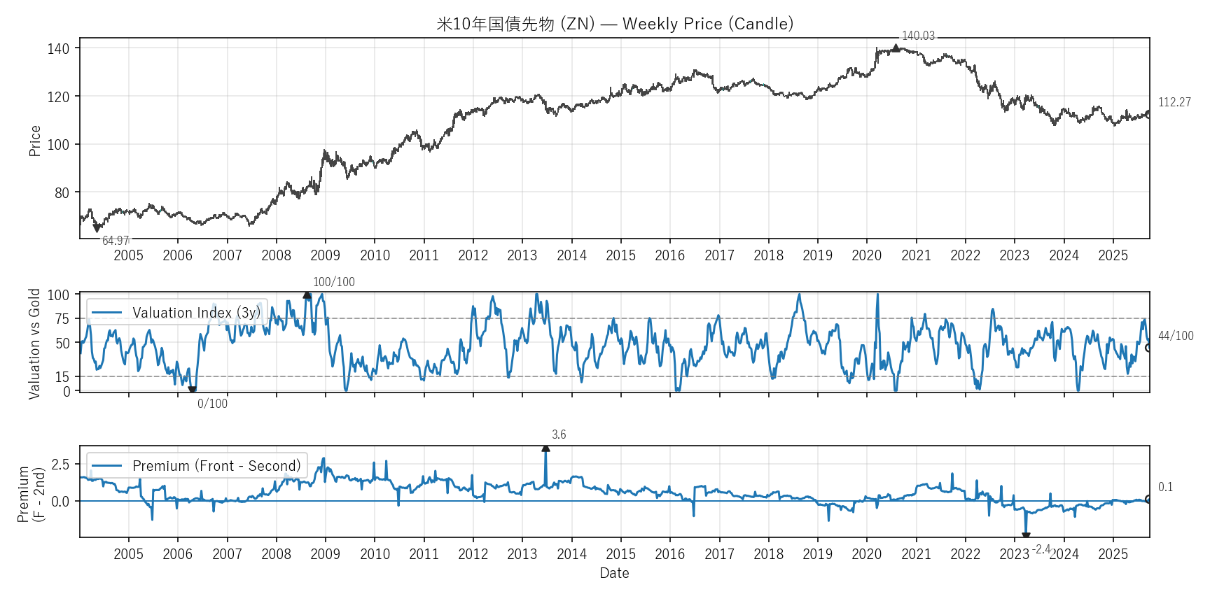 Valuation(WVI)は「基準資産と比べて相対的に高い/安いか」をみる指標。通常は金(GC)、金自身は米30年債(ZB)と比較。価格比(対象/参照×100)を短期/長期EMAで平滑化→差(PAL)の過去位置を0〜100で表示。PremiumはFront−Second(順鞘/逆鞘)。
