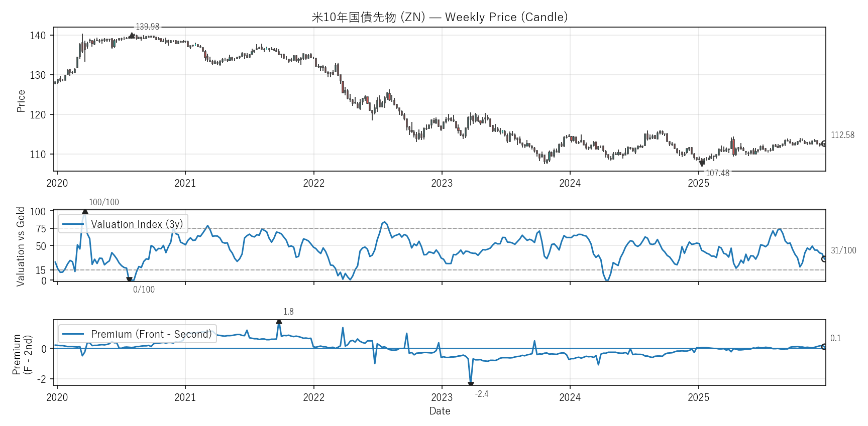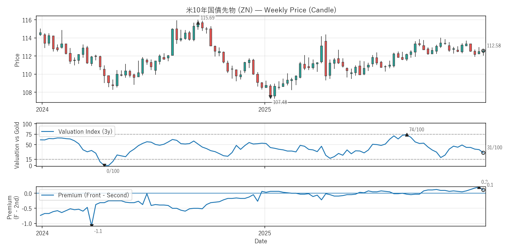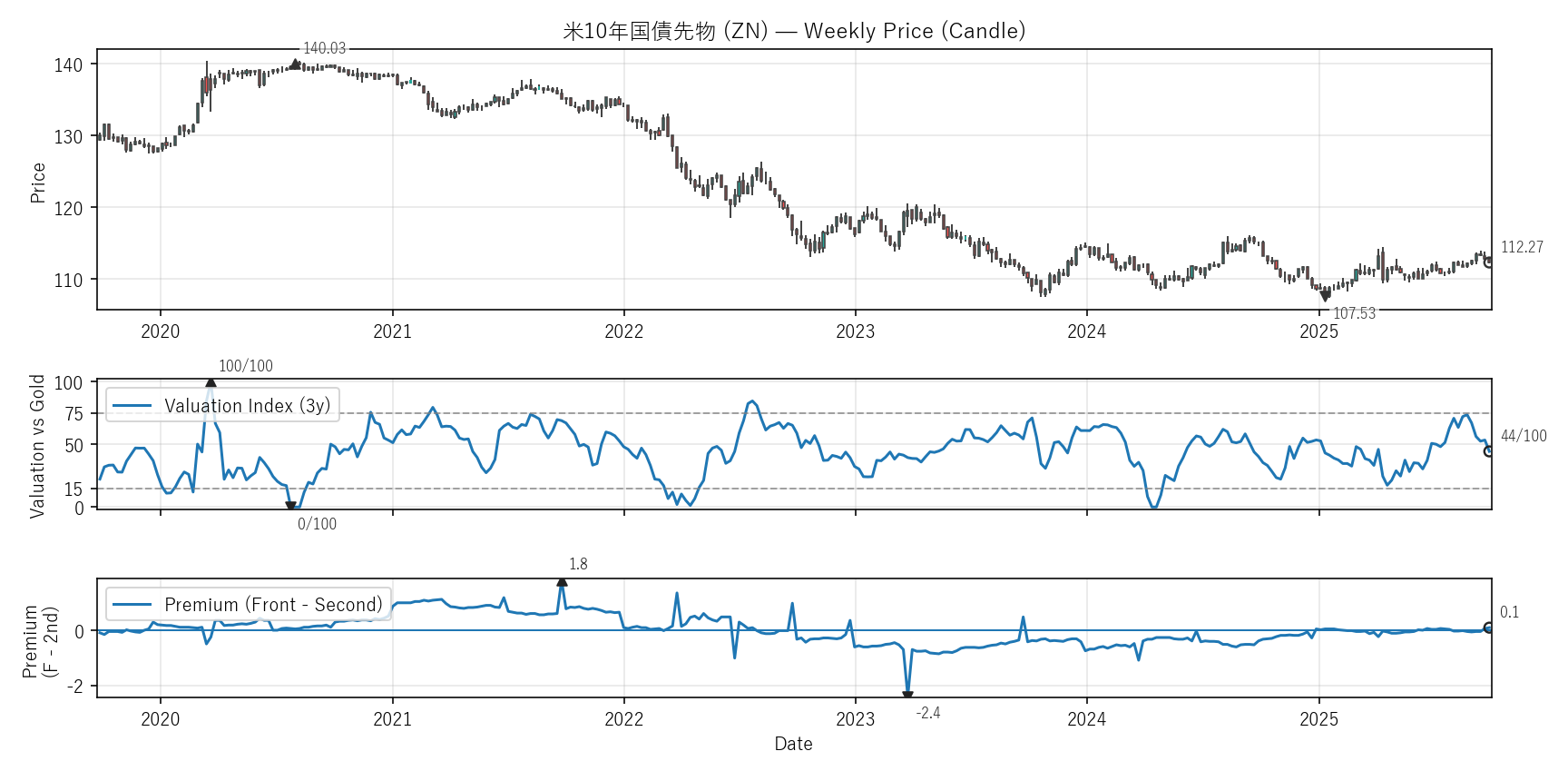 Valuation(WVI)は「基準資産と比べて相対的に高い/安いか」をみる指標。通常は金(GC)、金自身は米30年債(ZB)と比較。価格比(対象/参照×100)を短期/長期EMAで平滑化→差(PAL)の過去位置を0〜100で表示。PremiumはFront−Second(順鞘/逆鞘)。