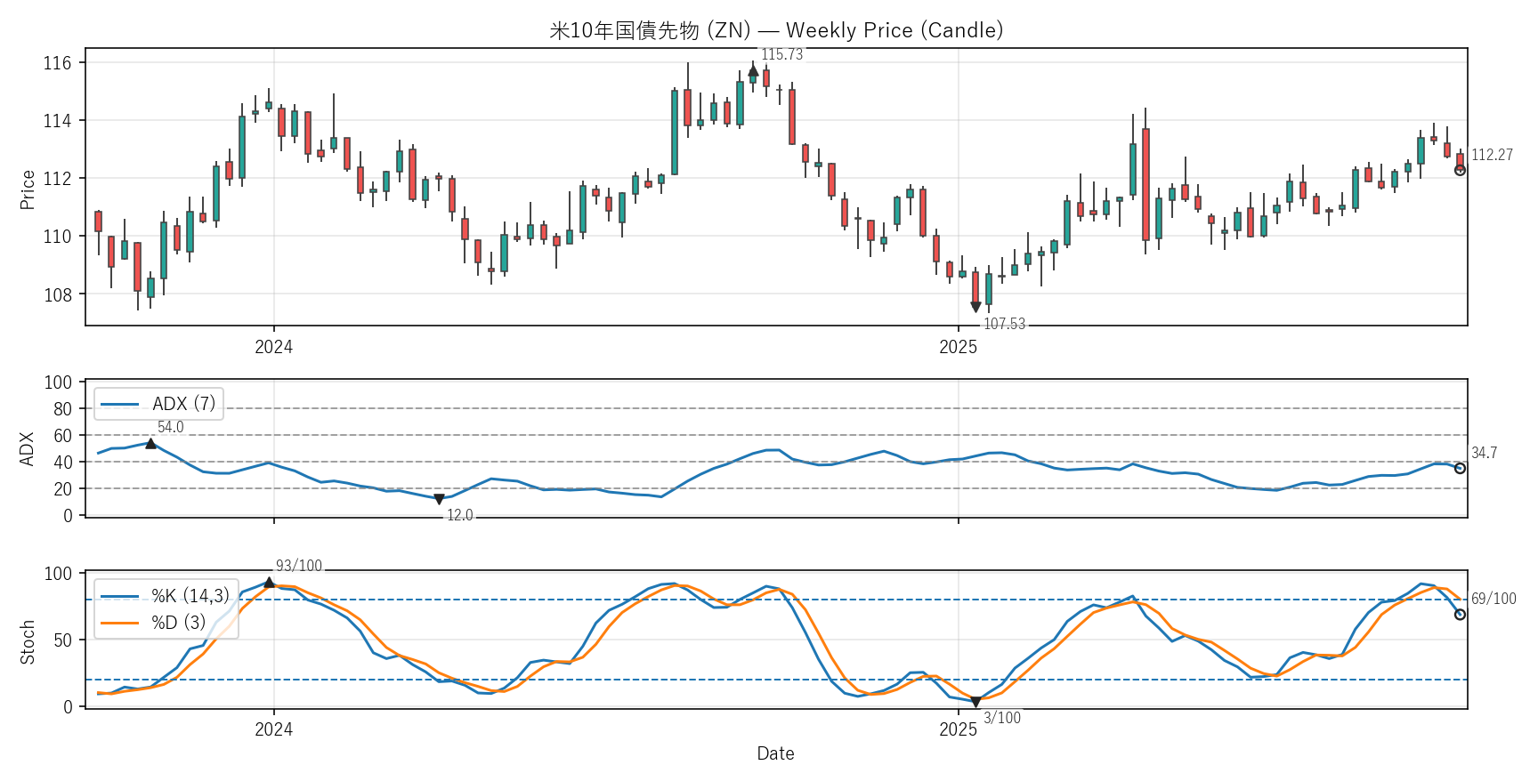 先週比(2025-09-26):週次リターン:-0.67%(終値 113.44 → 112.67) / ADX:-4.1pt(35 → 31)