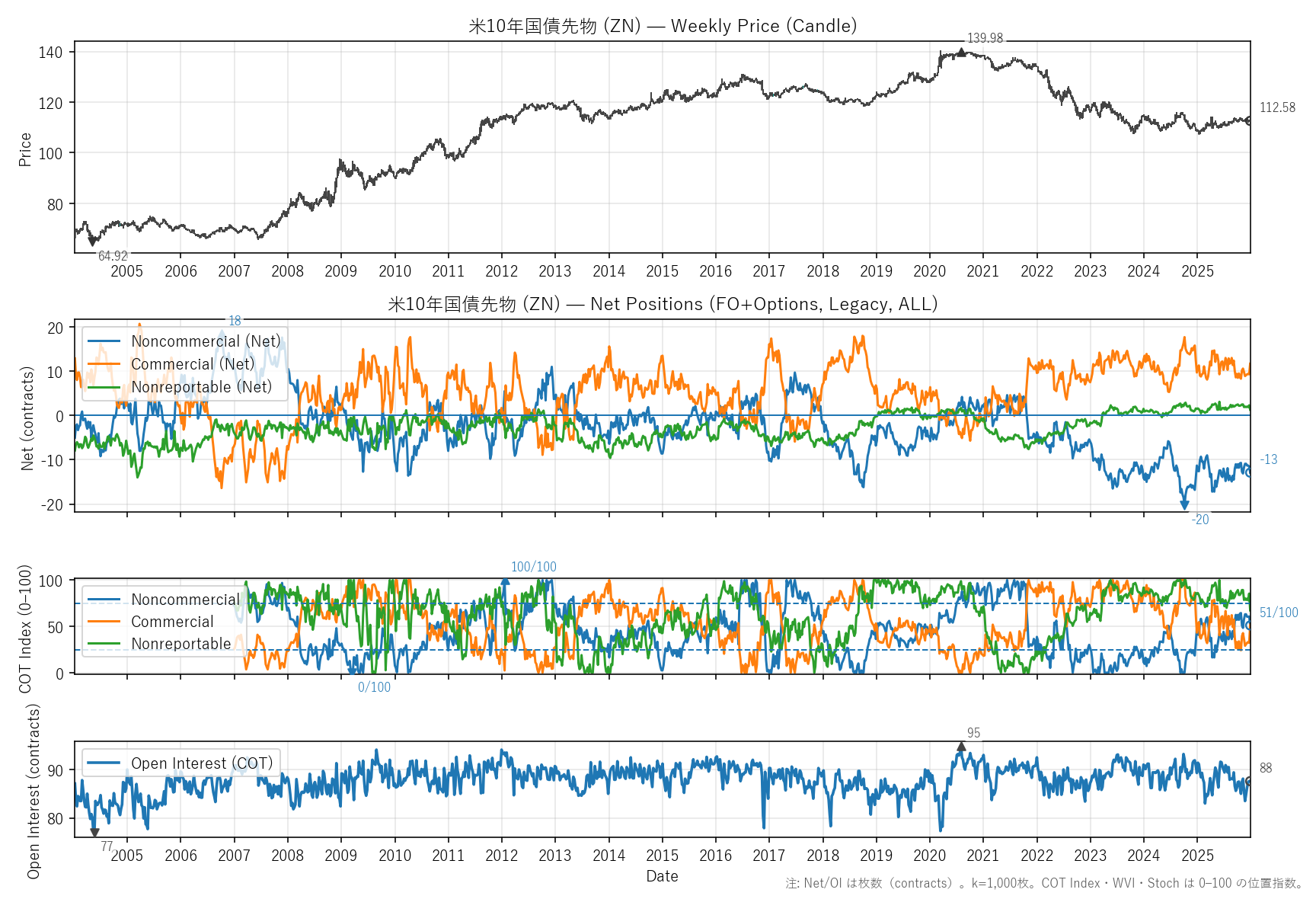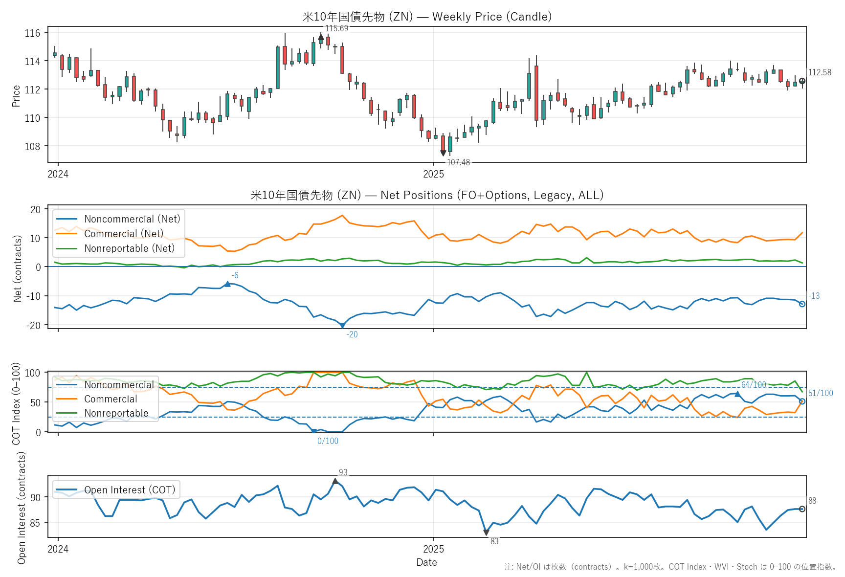 先週比(2025-12-26):非商業COT指数:-1pt(-11 → -13) / 商業COT指数:+2pt(9 → 12) / NR COT指数:-1pt(2 → 1) / Open Interest:-0.00%(88 → 88)