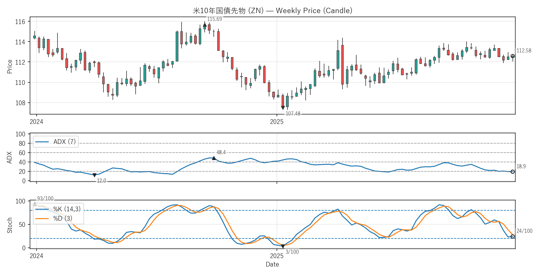 ADX:18.9(12.0〜75.9)|位置 11/100 / Stoch %K:24(3〜96)|位置 23/100