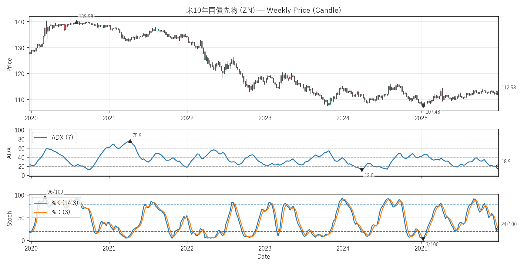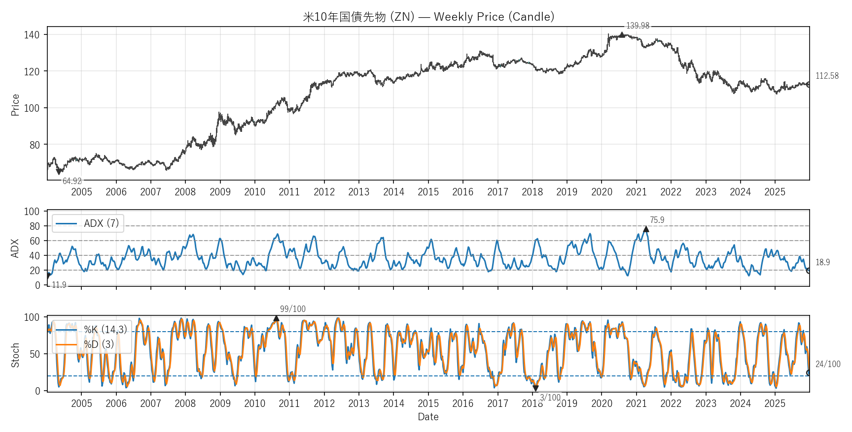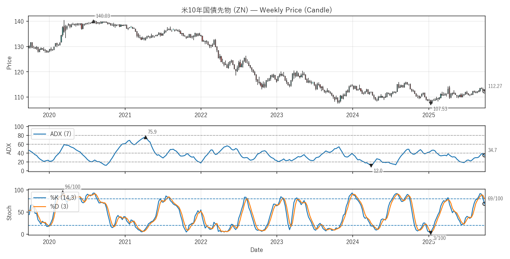 テクニカルは勢い(ADX)と位置(Stoch %K)。ADXは20超=発生、40超=強め。Stochは0〜100で80以上/20以下が目安。