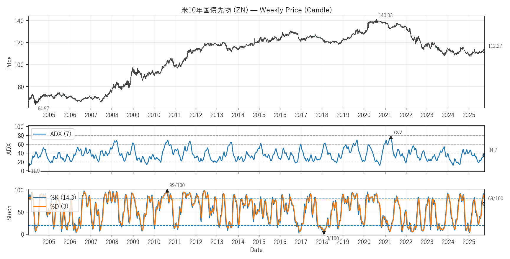 米10年国債先物(10Y T-Note)。FX/CFD例: US10Y(表記は業者差)。注意: ベンチマーク利回りに連動、価格と利回りは逆。