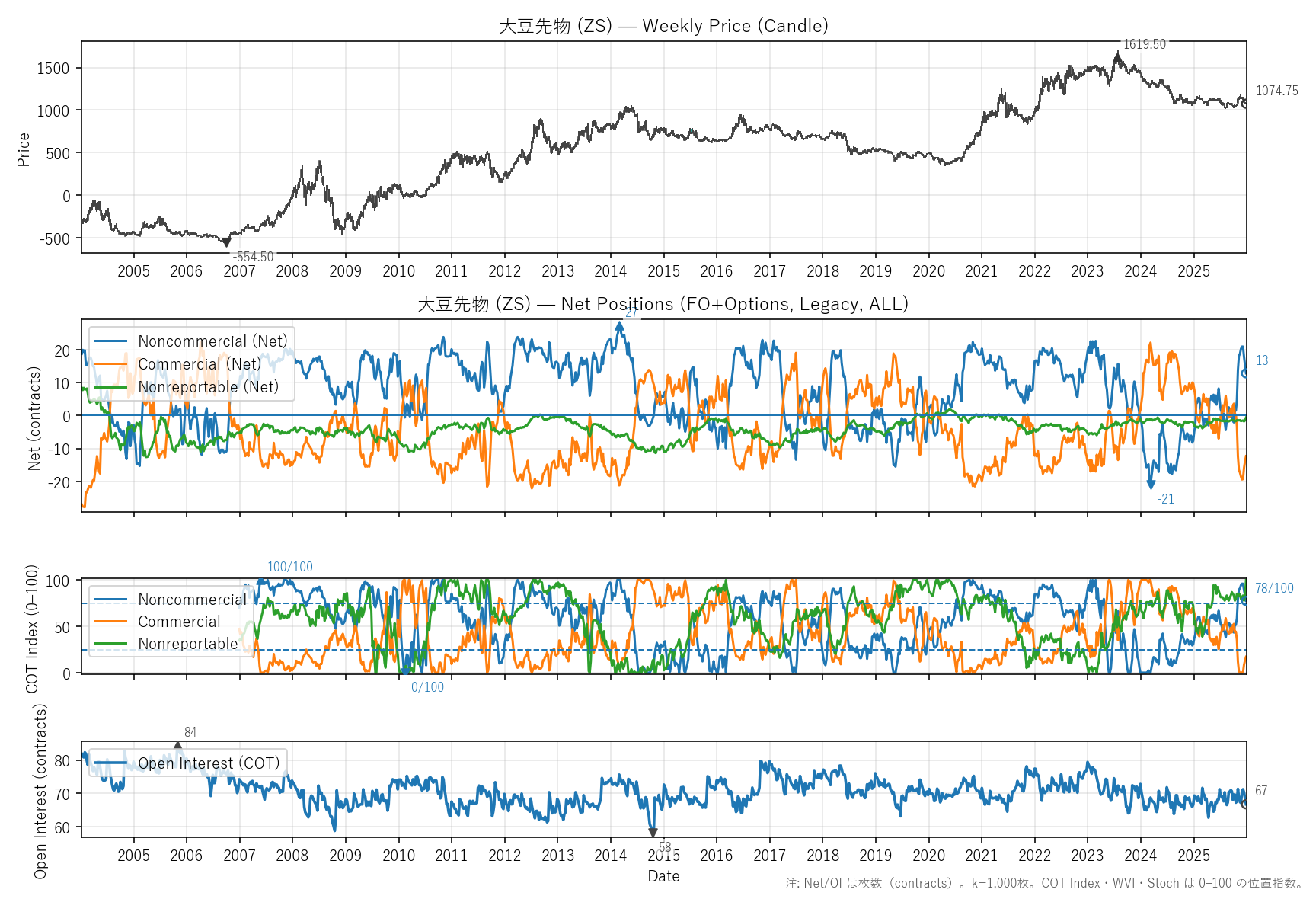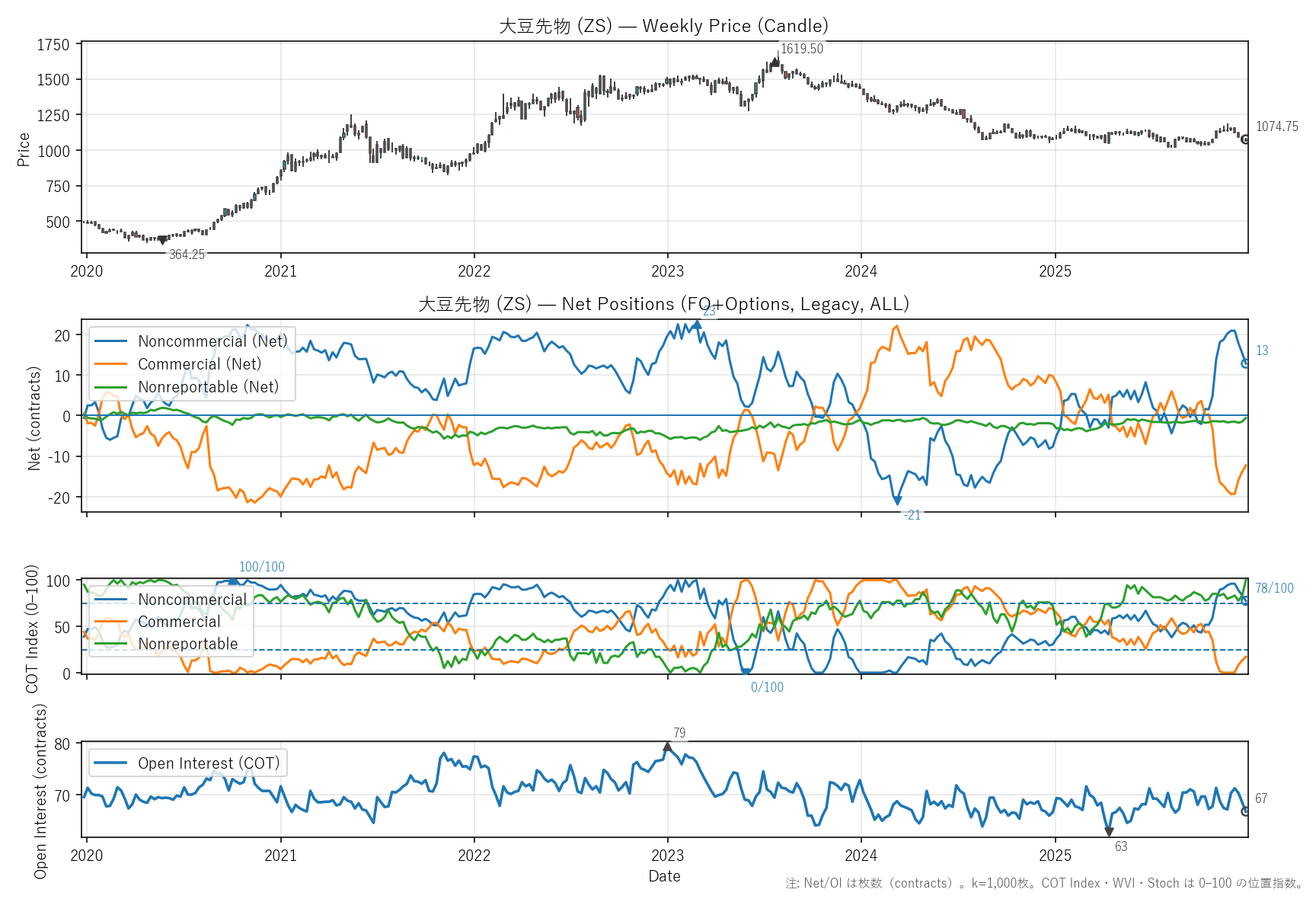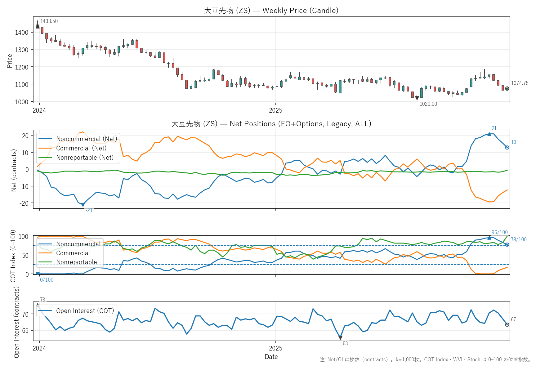 先週比(2025-12-26):非商業COT指数:-3pt(15 → 13) / 商業COT指数:+2pt(-14 → -12) / NR COT指数:+1pt(-2 → -1) / Open Interest:-2.63%(68 → 67)
