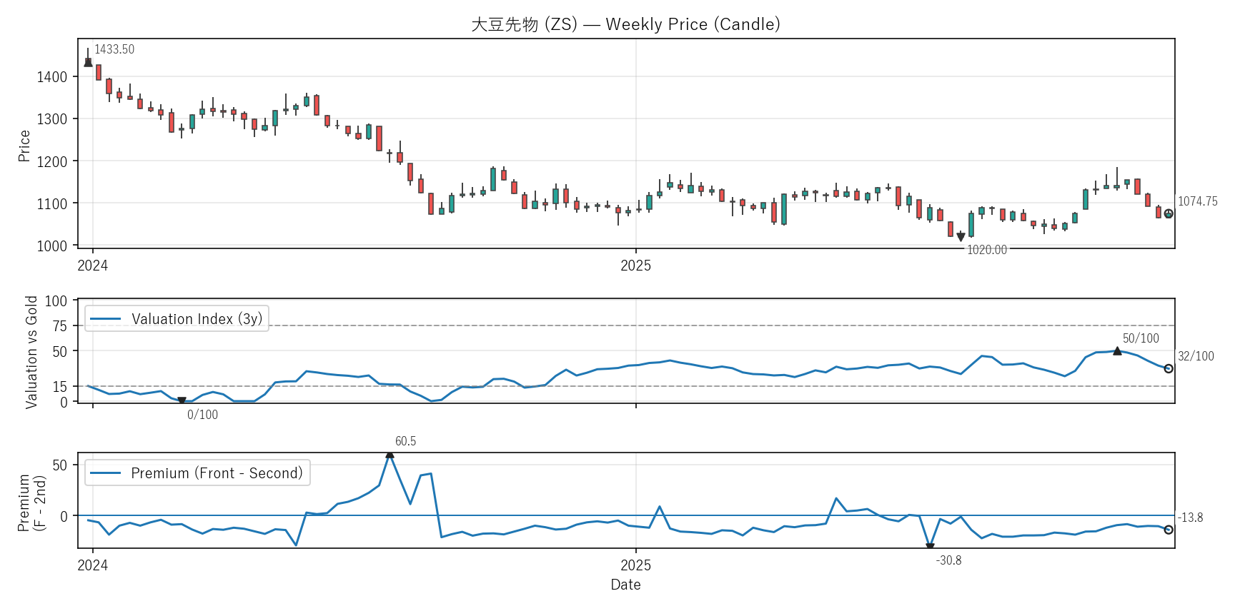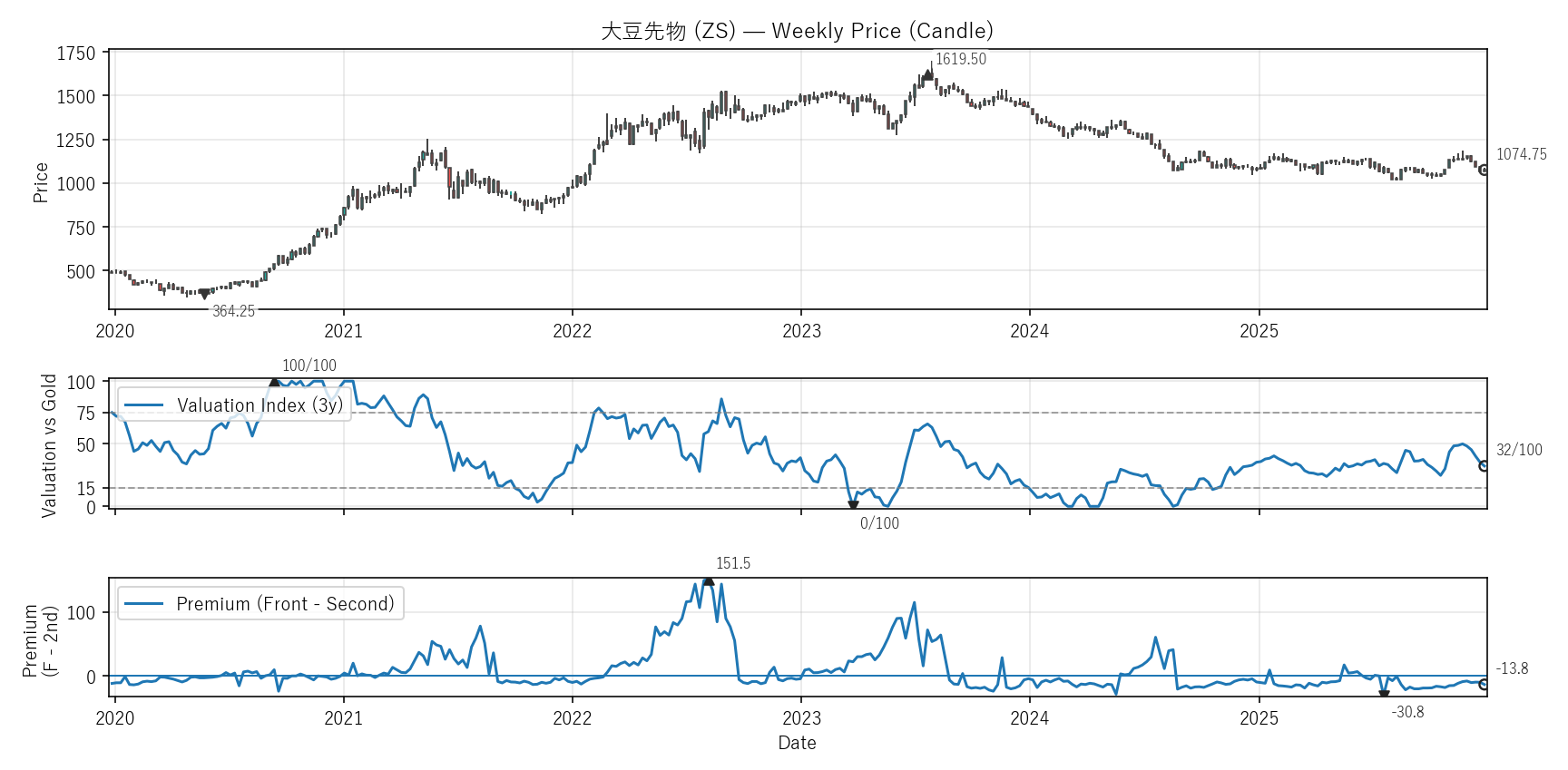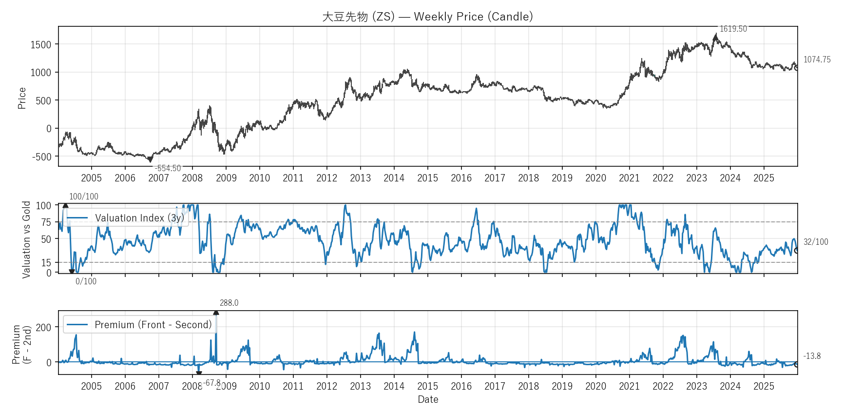 Valuation(WVI)は「基準資産と比べて相対的に高い/安いか」をみる指標。通常は金(GC)、金自身は米30年債(ZB)と比較。価格比(対象/参照×100)を短期/長期EMAで平滑化→差(PAL)の過去位置を0〜100で表示。PremiumはFront−Second(順鞘/逆鞘)。