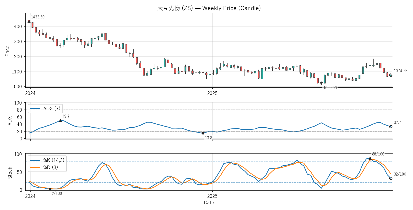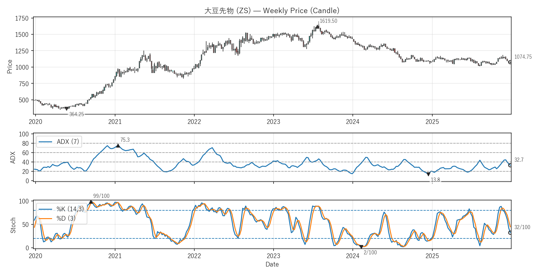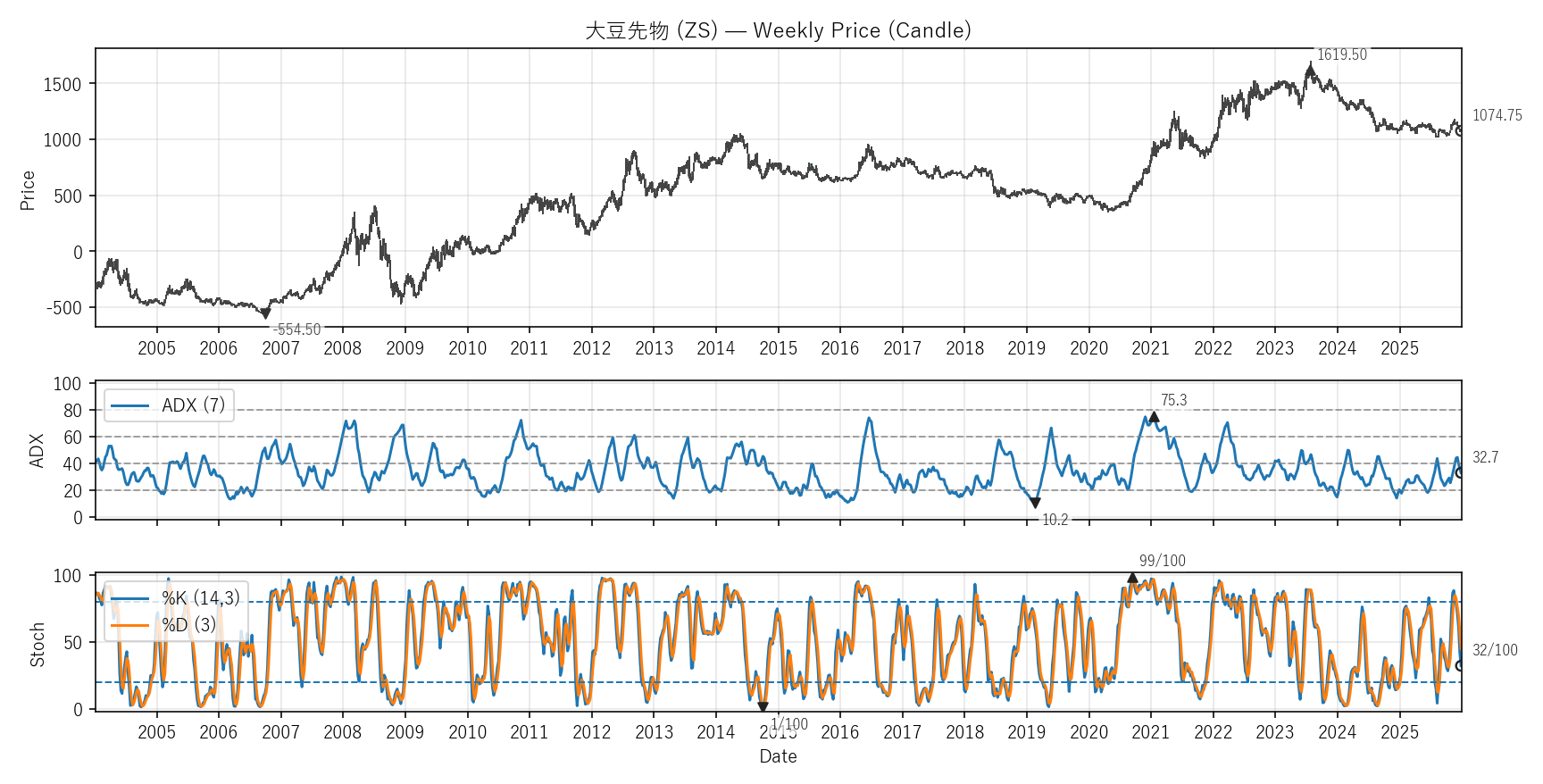 テクニカルは勢い(ADX)と位置(Stoch %K)。ADXは20超=発生、40超=強め。Stochは0〜100で80以上/20以下が目安。