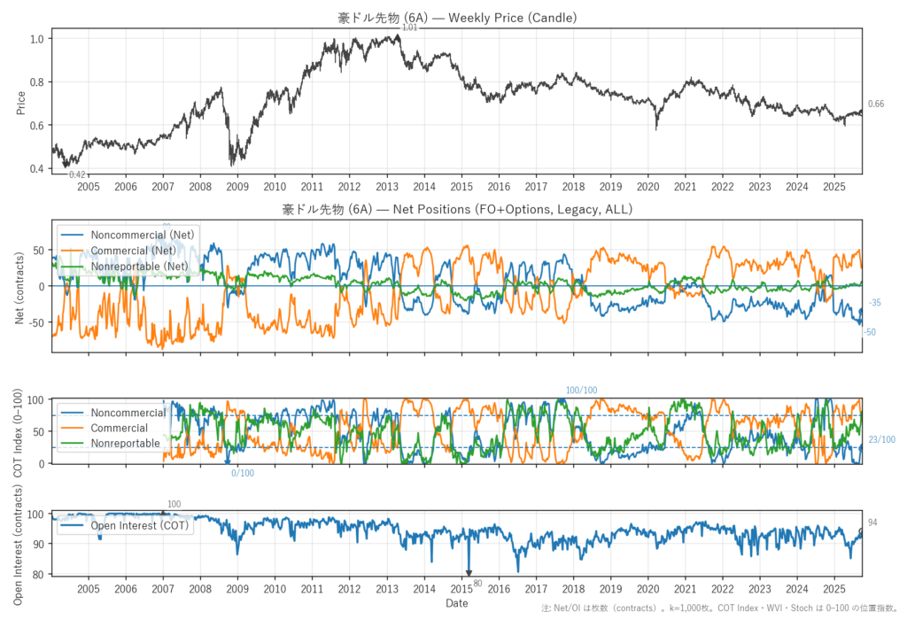 更新: 2025年9月27日 に最新データで更新しました。(COT週次データ: 2025-09-26 時点) 豪ドル先物のCOTレポートです。 この銘柄について 豪ドル/米ドルの先物。FX/CFD例: AUDUSD。資源・中国関連ニュースに反応しやすい。 COTレポート(ネット・COTイン... -