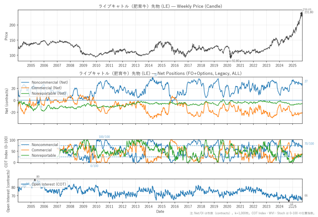 更新: 2025年9月27日 に最新データで更新しました。(COT週次データ: 2025-09-26 時点) ライブキャトル(肥育牛)先物のCOTレポートです。 この銘柄について ライブキャトル(肥育牛)先物。FX/CFD例: (業者依存)。注意: 供給サイクル・季節要因に注意... -