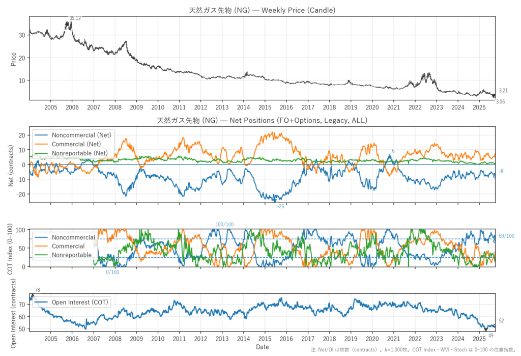 更新: 2025年9月27日 に最新データで更新しました。(COT週次データ: 2025-09-26 時点) 天然ガス先物のCOTレポートです。 この銘柄について 天然ガス先物(Henry Hub)。FX/CFD例: NATGAS。注意: きわめてボラティリティが高く、在庫・天候で急変。 COTレ... -