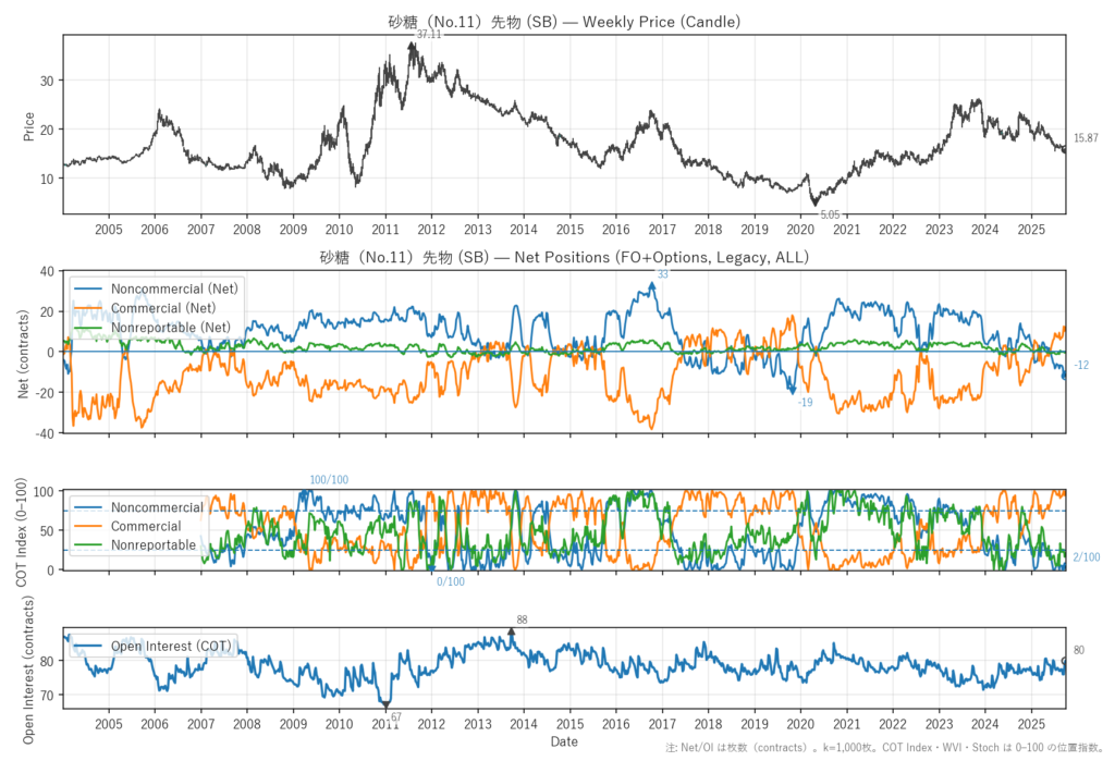 更新: 2025年9月27日 に最新データで更新しました。(COT週次データ: 2025-09-26 時点) 砂糖(No.11)先物のCOTレポートです。 この銘柄について 砂糖(No.11)先物。FX/CFD例: SUGAR。注意: 産地天候・エタノール政策・BRL(ブラジルレアル)に影響され... -