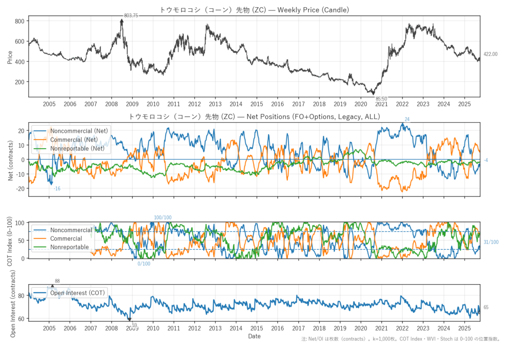 更新: 2025年9月27日 に最新データで更新しました。(COT週次データ: 2025-09-26 時点) トウモロコシ(コーン)先物のCOTレポートです。 この銘柄について トウモロコシ(Corn)先物。FX/CFD例: CORN。注意: 天候・作付面積・USDA統計で動きやすい。 COT... -