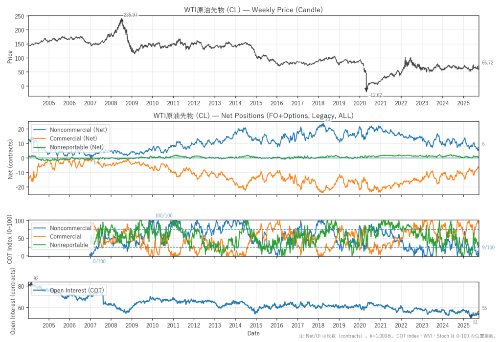 更新: 2025年9月27日 に最新データで更新しました。(COT週次データ: 2025-09-26 時点) WTI原油先物のCOTレポートです。 この銘柄について WTI原油先物。FX/CFD例: USOIL/WTI。注意: 順鞘・逆鞘や在庫統計でプレミアムが変動、ロール影響に留意。 COTレポ... -