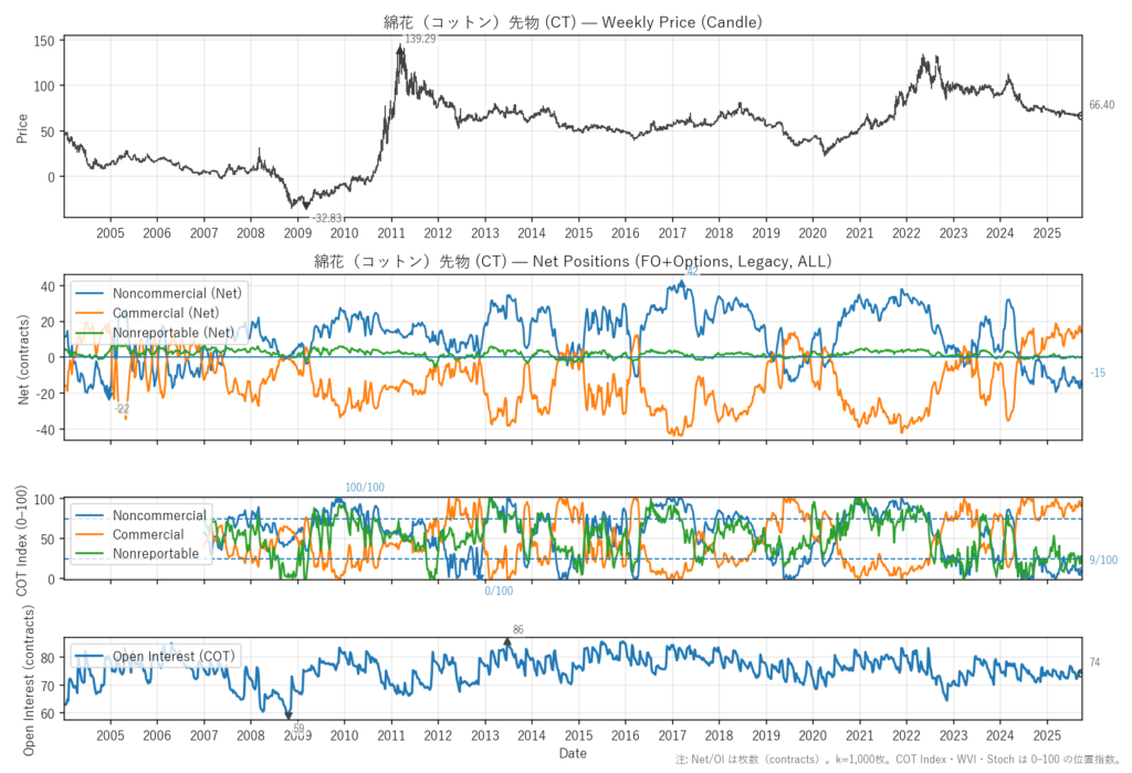 更新: 2025年9月27日 に最新データで更新しました。(COT週次データ: 2025-09-26 時点) 綿花(コットン)先物のCOTレポートです。 この銘柄について 綿花(Cotton No.2)先物。FX/CFD例: COTTON。注意: 天候・USDA統計の影響が大きい。 COTレポート(ネッ... -