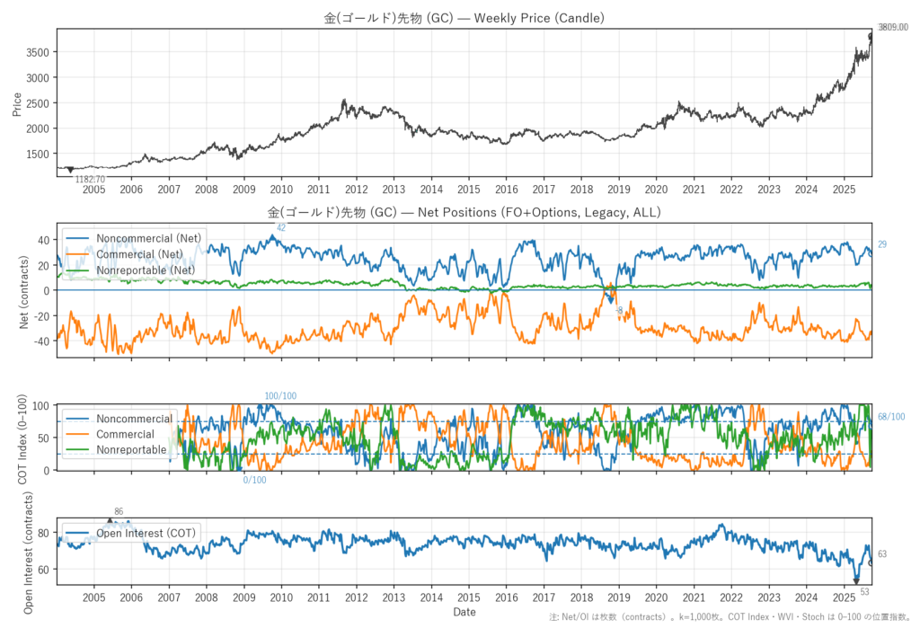 更新: 2025年9月27日 に最新データで更新しました。(COT週次データ: 2025-09-26 時点) 金(ゴールド)先物のCOTレポートです。 この銘柄について 金(Gold)先物。FX/CFD例: XAUUSD。注意: しばしば米金利・米ドルと逆相関、地政学で急騰しやすい。 COTレ... -