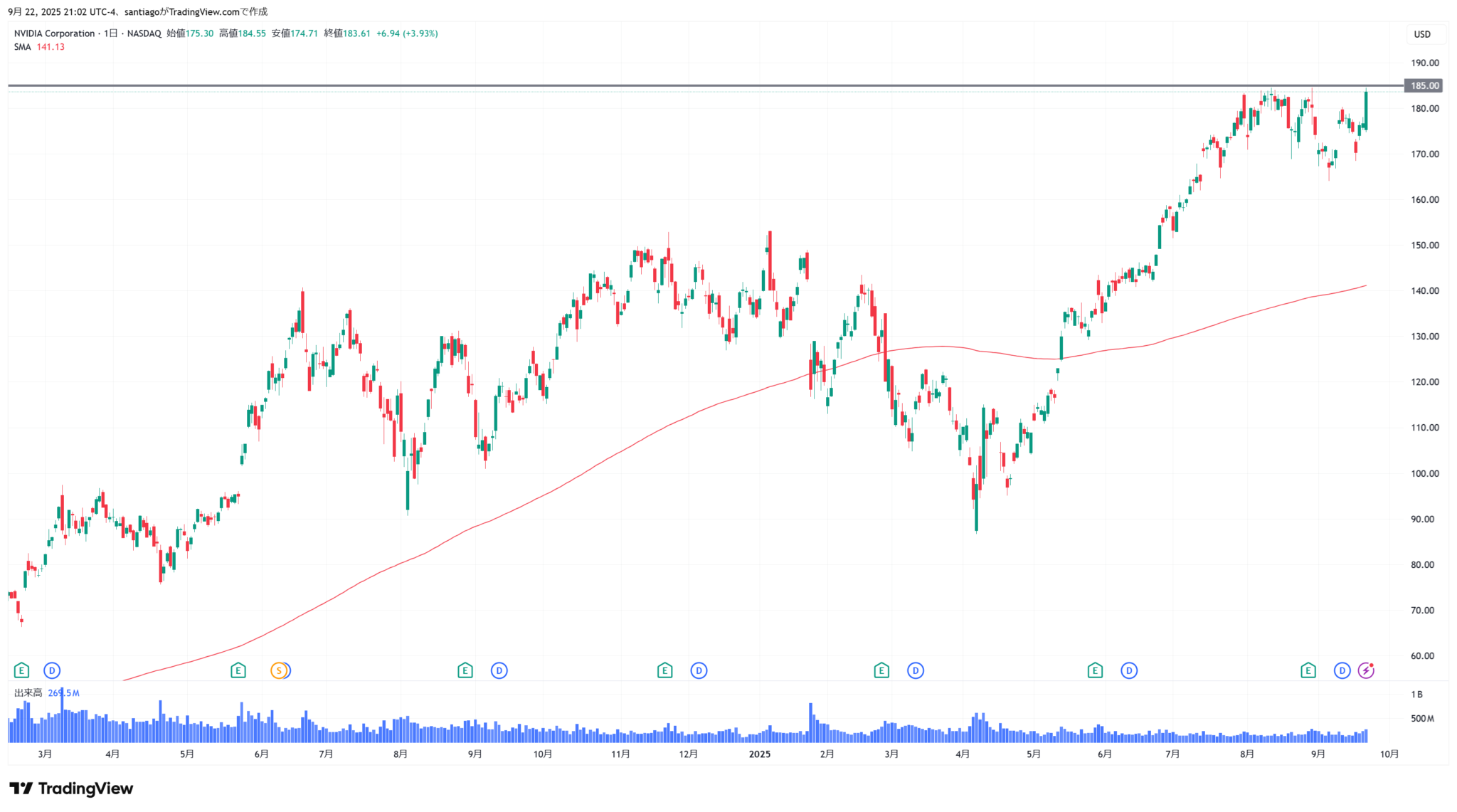 個別株ではNvidia(NVDA)が大きな話題となりました。同社はOpenAIに最大1000億ドルを投資する計画を発表し、株価は一時的に横ばいのレンジを上抜けました。AI関連テーマは引き続き市場の盛り上がりを支える存在であり、投資家心理を押し上げています。185より上に伸びて定着できるかに注目です。