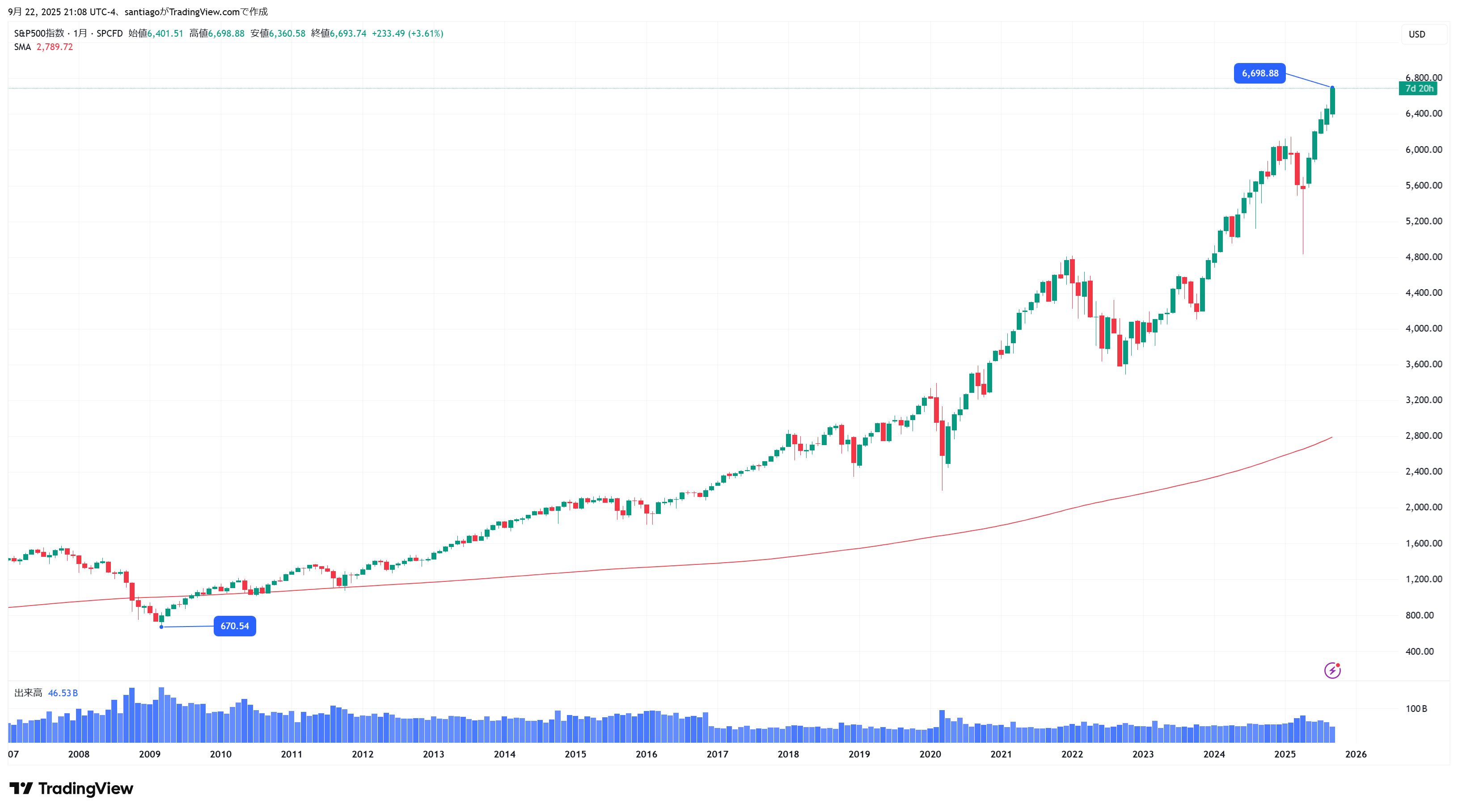 S&P500は2009年のリーマン・ショック直後につけた安値から、2025年現在でおよそ10倍になっています。20年以内で指数が10倍になるのは歴史的にみても珍しいケースです。これは金融緩和やIT革命、AIブームなど複数の追い風が重なった結果ですが、同時に過去の平均からすると行き過ぎた動きとも言えます。相場が大きく上がった後は、調整や反動が起きやすいのも歴史の教えるところです。