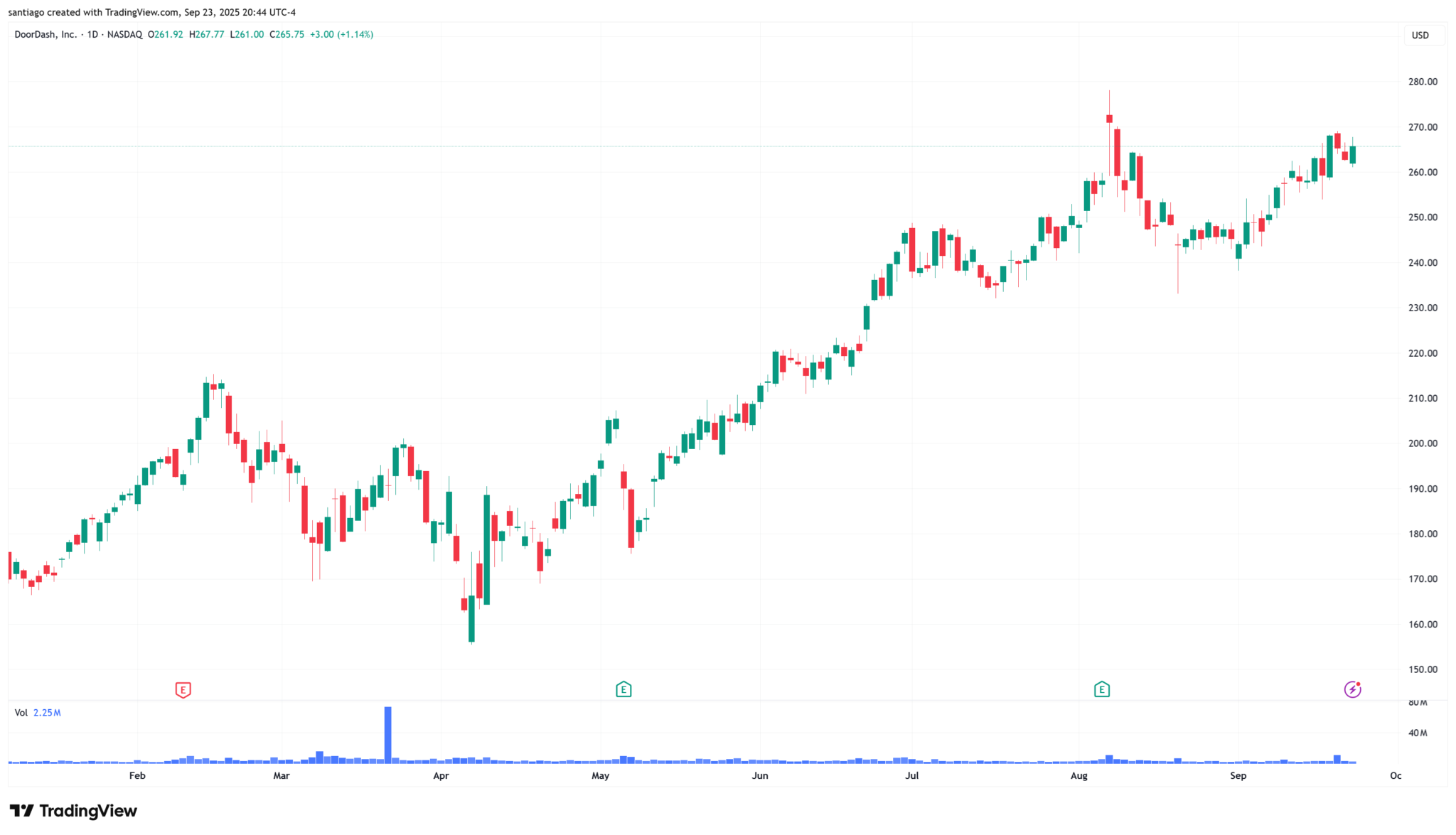 DASHは今、チャート上でしっかりしたカップウィズハンドルになりそうなレンジを形成しており、順張りのブレイクアウト手法で典型的な買い候補として注目される形になっています。RSレーティングという株価の強さを示す指標は80台後半と高く、相対力線も高値圏。市場全体が揺れる中でも基調の強さを見せています。