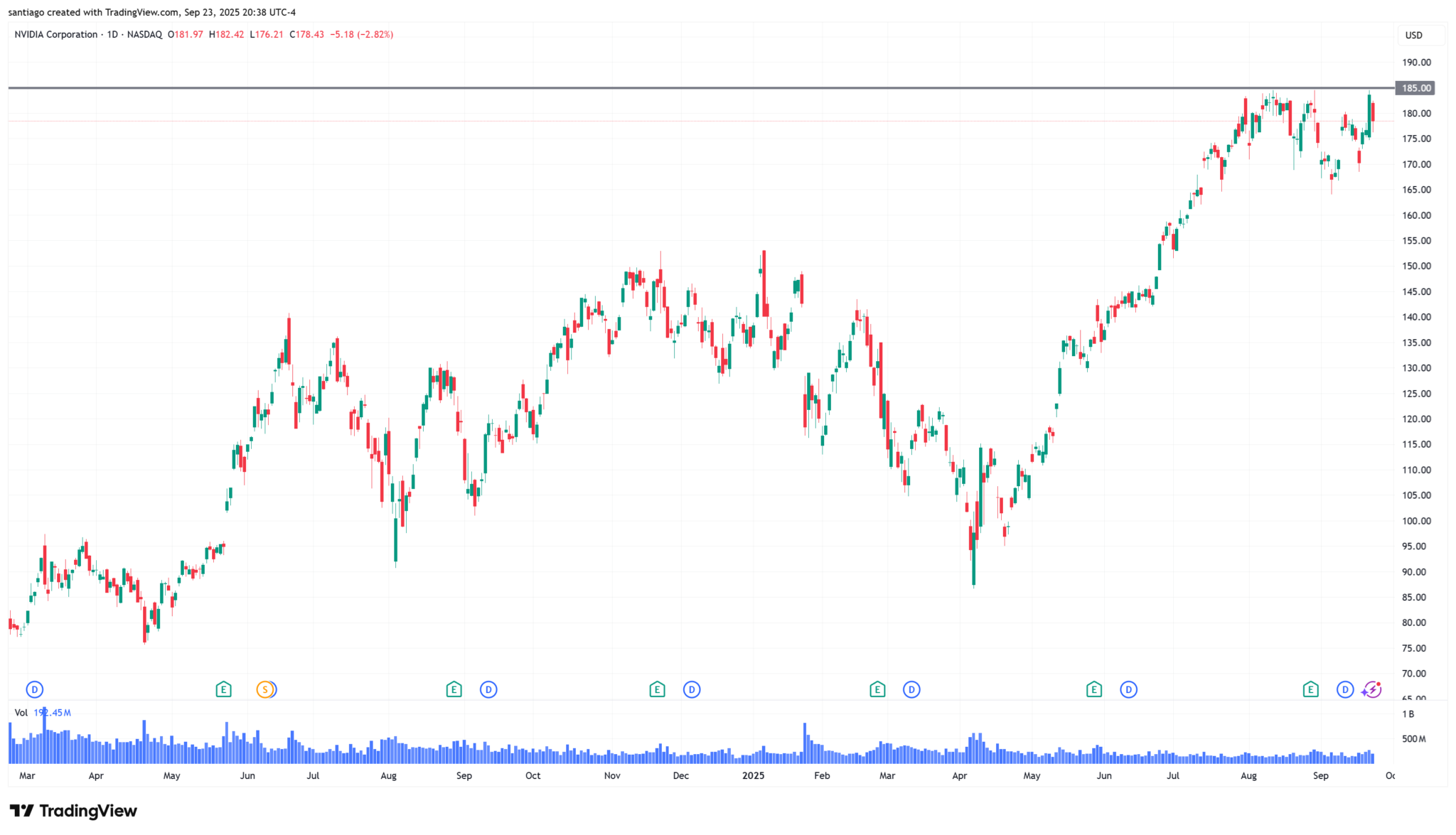 NVDAは前日にAI関連ニュースで大きく上昇した反動で2%下げ。ただし出来高は少なく、チャート上では買いの形は崩れていません。184.48ドルを超えればテクニカル的には新しい買いシグナルとされる水準です。