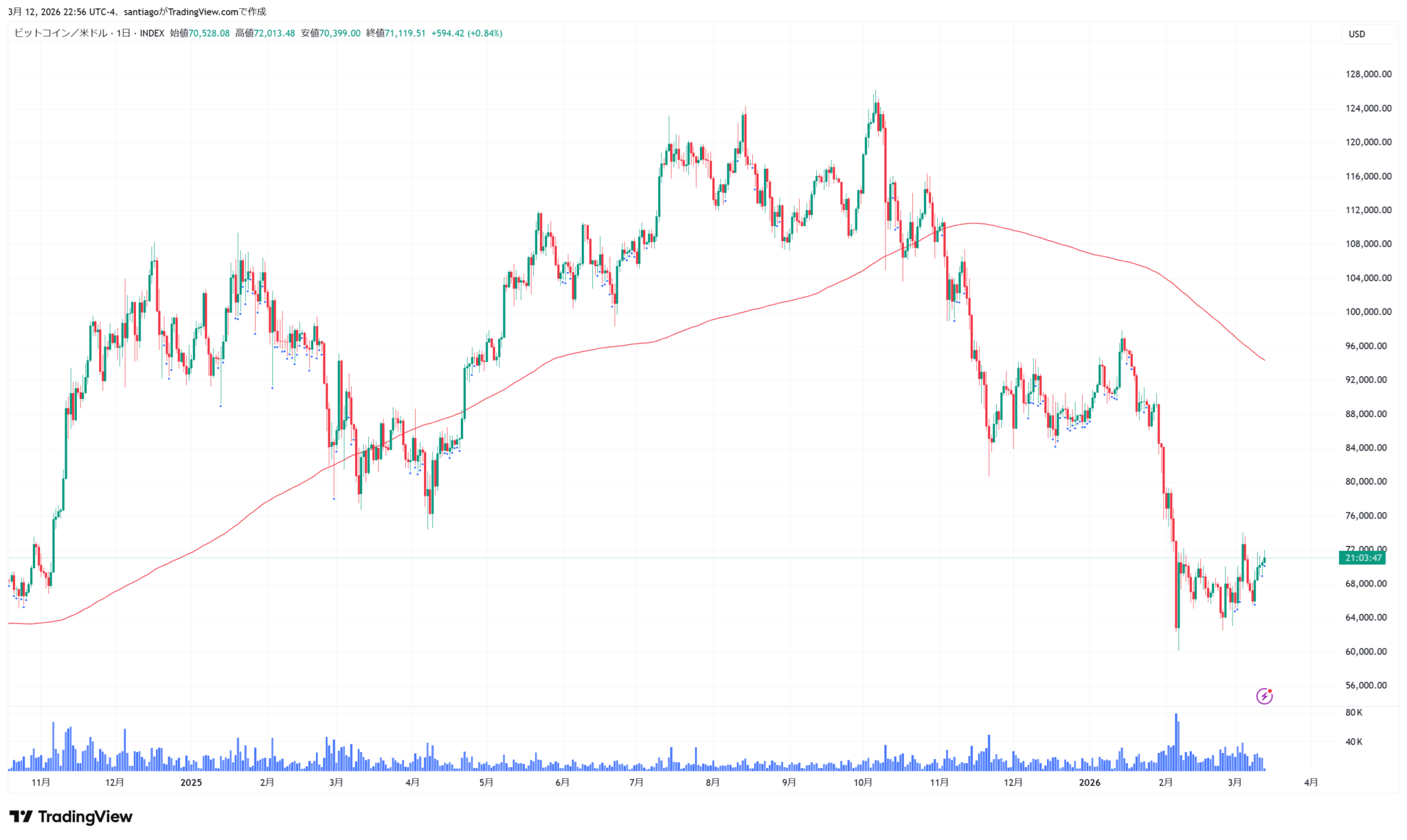 これビットコインの日足です。もちろん下降トレンドにはなっていますが、イラン情勢の下落はそれほどでもなく、むしろ株よりも安定します。ここ1か月は上昇しているぐらいです。