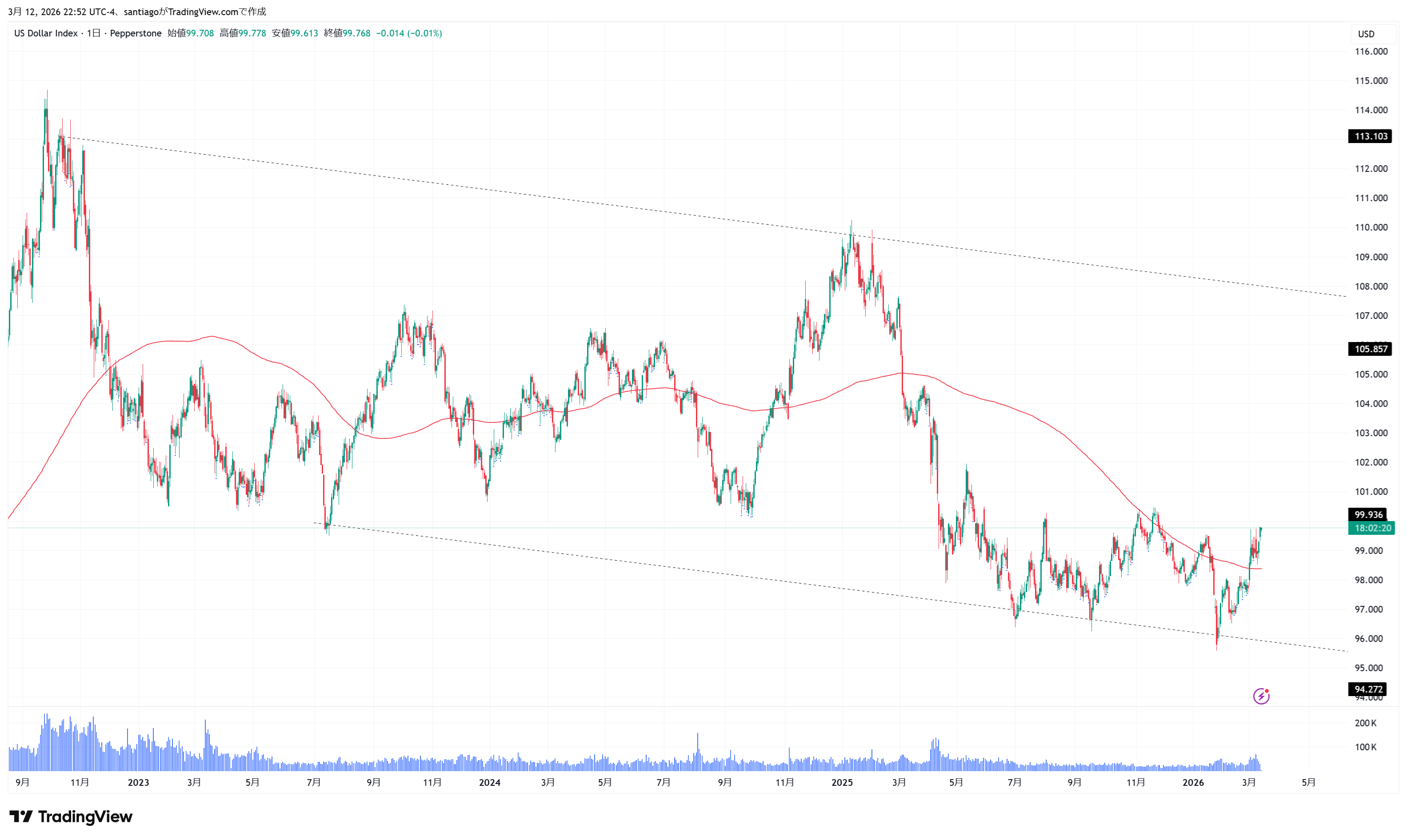ドルが強くなると、世界の金融環境はやや引き締まりやすくなります。逆にドルが弱くなると、資金がリスク資産に流れやすくなります。